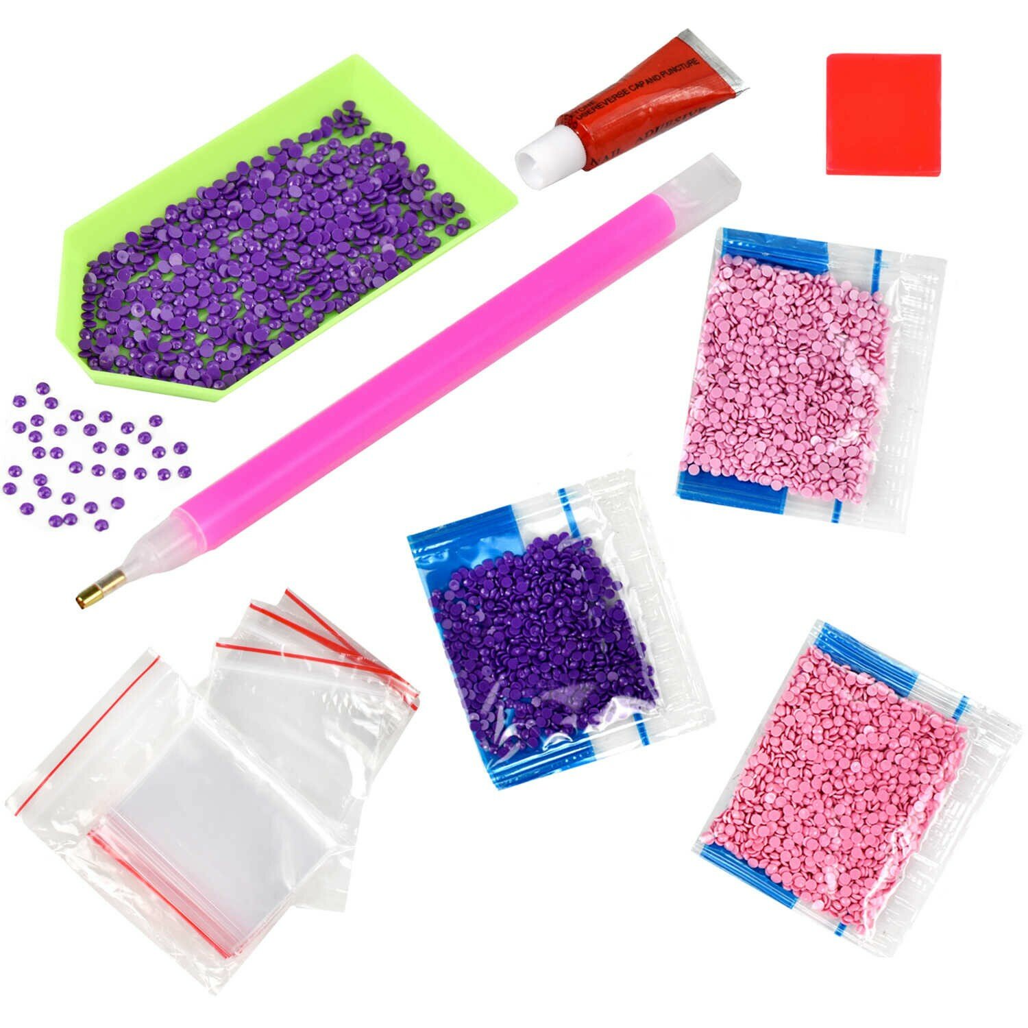В комплекте: 23 цветов страз, холст с напечатанной картиной, покрытый клеевым слоем и защитной пленкой, пакеты со стразами, лоток для страз, стилус, силикон для страз, клей, схема, дополнительные пакеты с zip-молнией.
