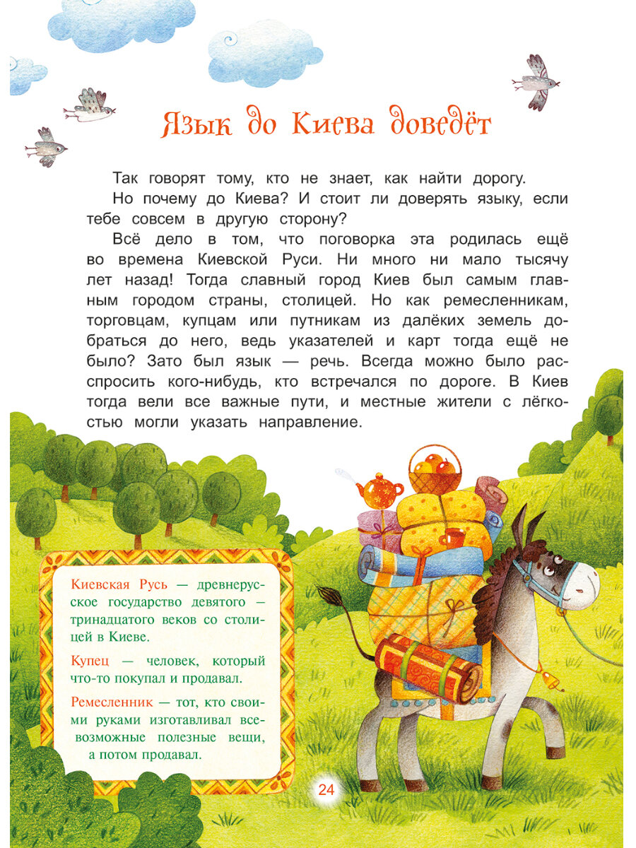 Как можно узнавать историю своего народа? На уроке за партой. Или из умных книжек, написанных серьёзными учёными… А можно просто прислушаться к тому, как разговаривают взрослые. Пословицы и поговорки пришли в нашу жизнь из глубины веков, рассказывают о событиях древних времён, но при этом они актуальны, востребованы и украшают современный русский язык. В нескольких словах, которые были знакомы ещё нашим прапрабабушкам, раскрывается история страны, звучит житейская мудрость, замешанная на крестьянской смекалке, искрится народный юмор. Рассказ об истории крылатых выражений сопровождают интересные факты, которые вызовут интерес у юных читателей XXI века, и исторические справки, превращающие каждую пословицу в картину народной жизни с её бытом, традициями, праздниками, радостями и огорчениями.