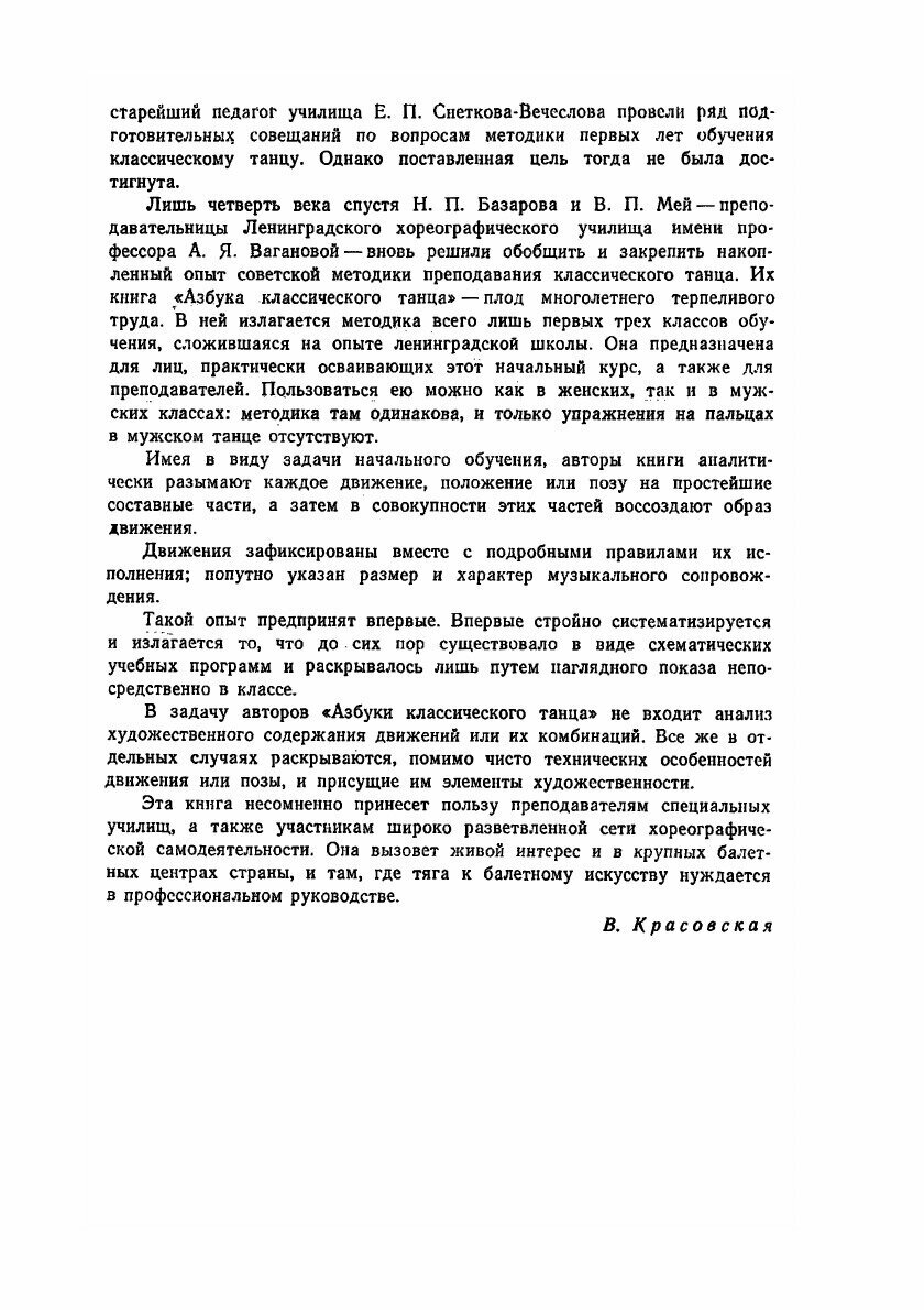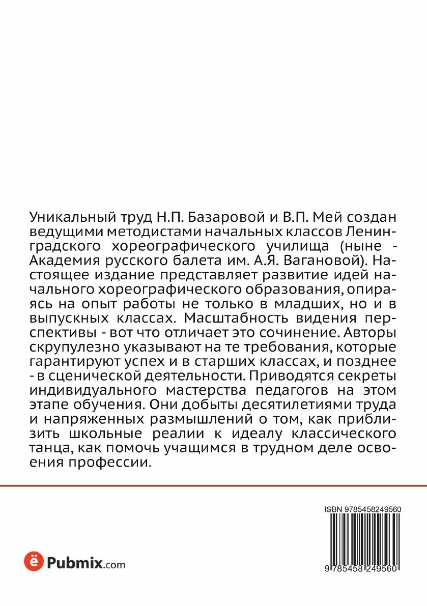 Уникальный труд Н.П. Базаровой и В.П. Мей создан ведущими методистами начальных классов Ленинградского хореографического училища (ныне - Академия русского балета им. А.Я. Вагановой). Настоящее издание представляет развитие идей начального хореографического образования, опираясь на опыт работы не только в младших, но и в выпускных классах. Масштабность видения перспективы - вот что отличает это сочинение. Авторы скрупулезно указывают на те требования, которые гарантируют успех и в старших классах, и позднее - в сценической деятельности. Приводятся секреты индивидуального мастерства педагогов на этом этапе обучения. Они добыты десятилетиями труда и напряженных размышлений о том, как приблизить школьные реалии к идеалу классического танца, как помочь учащимся в трудном деле освоения профессии.