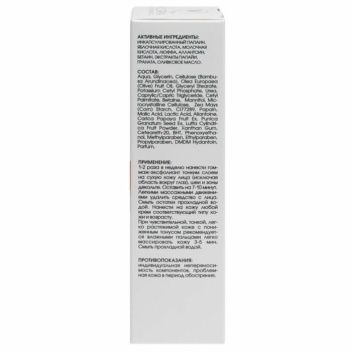 Состав: Aqua, Glycerin, Cellulose (Bambusa Arundinacea), Olea Europaea (Olive) Fruit Oil, Glyceryl Stearate, Potassium Cetyl Phosphate, Urea, Caprylic/Capric Triglyceride, Cetyl Palmitate, Betaine, Mannitol, Microcrystalline Cellulose, Zea Mays (Corn) Starch, Cl77289, Papain, Malic Acid, Lactic Acid, Allantoine, Carica Papaya Fruit Ex, Punica Granatum Seed Ex, Luffa Cylindrica Fruit Powder, Xanthan Gum, Ceteareth-20, BHT, Phenoxyethanol, Methylparaben, Ethylparaben, Propylparaben, DMDM Hydantoin, Parfum.
