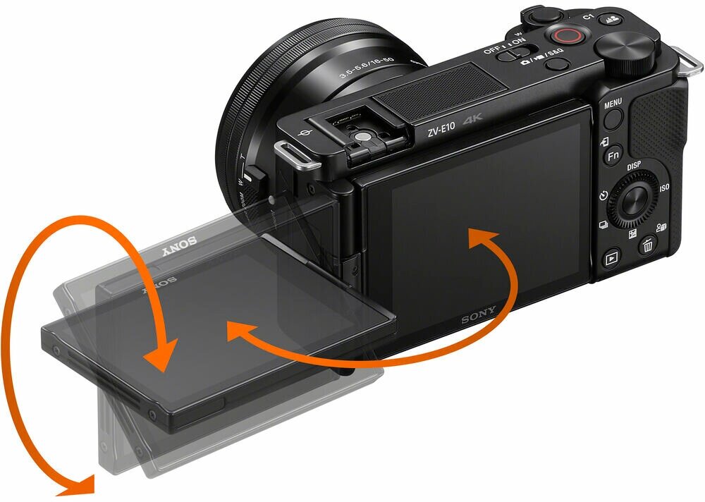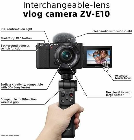 Беззеркальная камера со сменной оптикой, адресованная видеоблогерам. Основной упор в модели поставлен на функции видеозаписи: ролики камера пишет в максимальном разрешении 4К (3840х2160 пикселей) при 30 к/с, но с кропом картинки порядка 1.2х. Выжать из неё полноценный 4К без кропа можно при снижении фреймрейта записи до 24 к/с. Также в Sony ZV-E10 body есть замедленная видеосъёмка 120 к/с в Full HD, поддерживаются профили гамма-кривой S-Log3 и HLG. Звук камера пишет на трёхкапсульный микрофон с направленным режимом работы. В придачу к микро «из коробки» прилагается мохнатая ветрозащита. Вместо видоискателя безеркалку оснастили «горячим башмаком» для использования вспомогательного оборудования на манер внешнего микрофона или света. Сенсорный экран у камеры поворачивается в положение «селфи», при активации видеосъёмки картинку на нём обрамляет красная рамка. Модель не располагает встроенным стабом, взамен оператор вправе рассчитывать на стабилизированную оптику вкупе с электронной системой стабилизации изображения. В допраспоряжение пользователю предоставляются услуги разъёмов для подключения микрофона и наушников. Камеру можно использовать для стриминга, а при съёмке в меняющихся условиях освещения она автоматически подстраивает экспозицию с помощью фирменного алгоритма коррекции с приоритетом по лицу.