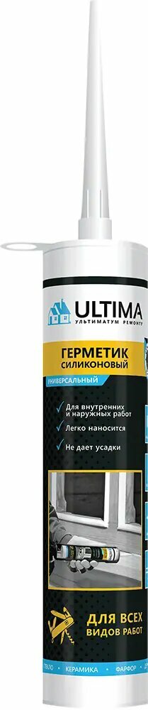 Универсальный силиконовый кислотный герметик ULTIMA Universal Silicone для уплотнения и герметизации стыковых и расширительных соединений во внутренних и наружных бытовых, ремонтных и строительных работах. Предназначен для уплотнения, соединения и защиты непористых поверхностей от проникновения воздуха и влаги, герметизации оконных рам, дверных коробок, витрин, стендов, панелей, герметизации стыков.