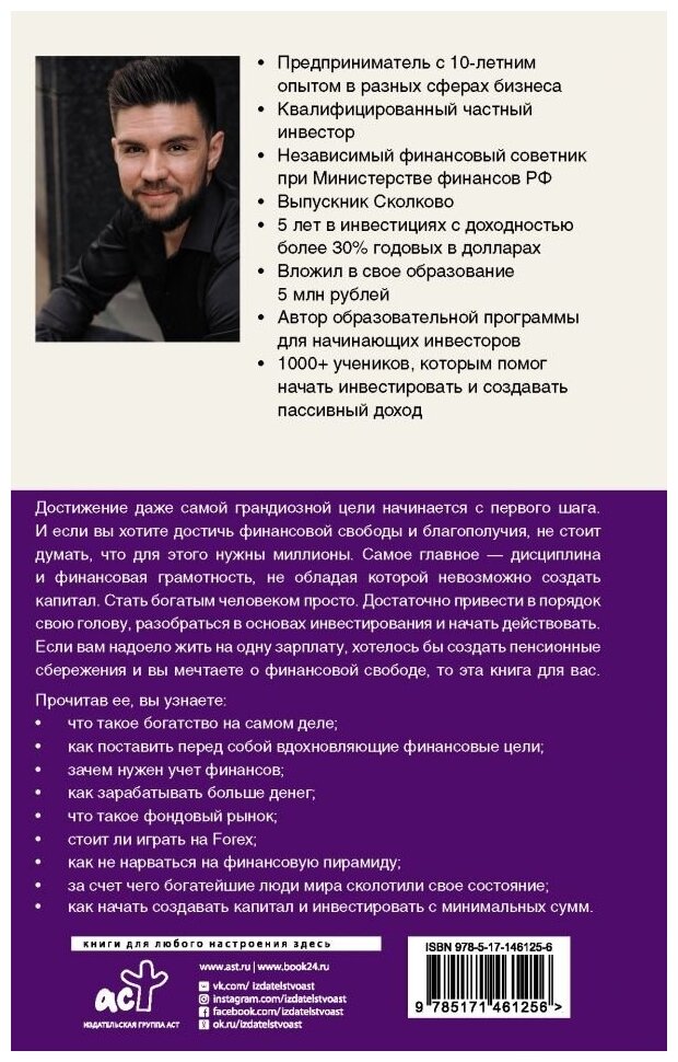 Достижение даже самой грандиозной цели начинается с первого шага. И если вы хотите достичь финансовой свободы и благополучия, не стоит думать, что для этого нужны миллионы. Самое главное — дисциплина и финансовая грамотность, не обладая которой невозможно создать капитал. Стать богатым человеком просто. Достаточно привести в порядок свою голову, разобраться в основах инвестирования и начать действовать.