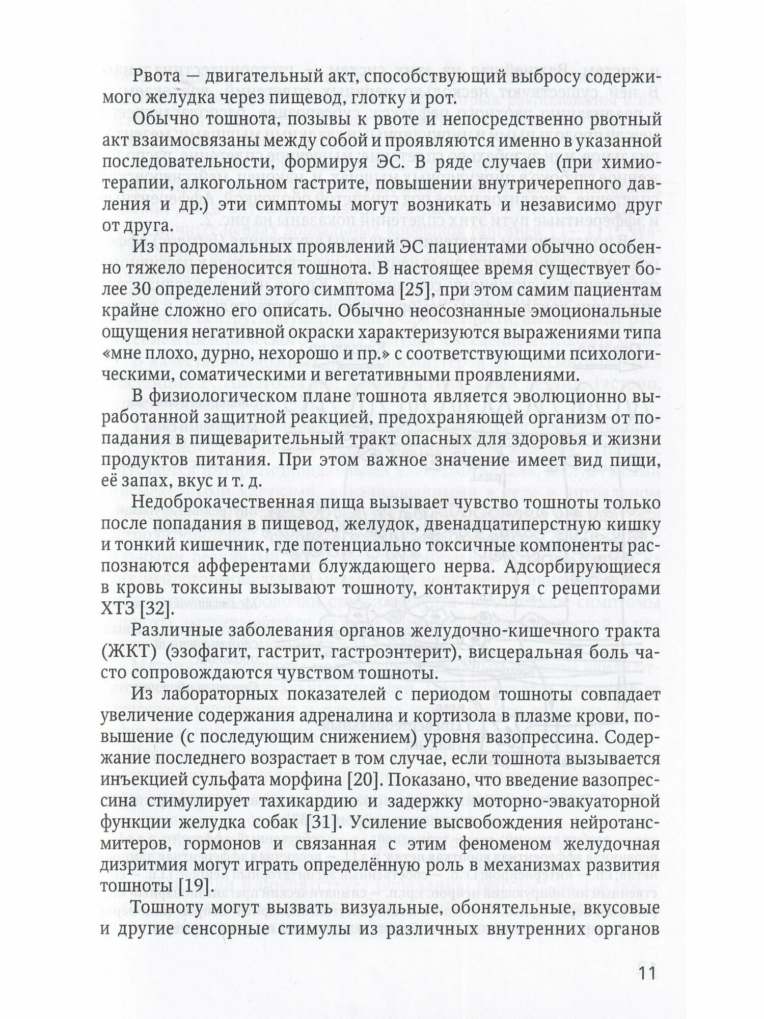В монографии изложены современные представления об этиологии, механизмах развития, средствах профилактики и купирования эметического синдрома. Приведены результаты исследований анатомии, физиологии и нейрохимии структур центральной и периферической нервной системы, вовлекаемых в реализацию рвотного рефлекса. Особое внимание уделено обзору современных средств профилактики и купирования различных вариантов "патологического" эметического синдрома: цитотоксической и радиационно-индуцированной тошноты и рвоты; болезни движения; постоперационной тошноты и рвоты; рвоты беременных; эметического синдрома при заболеваниях центральной нервной системы, желудочно-кишечного тракта и др.