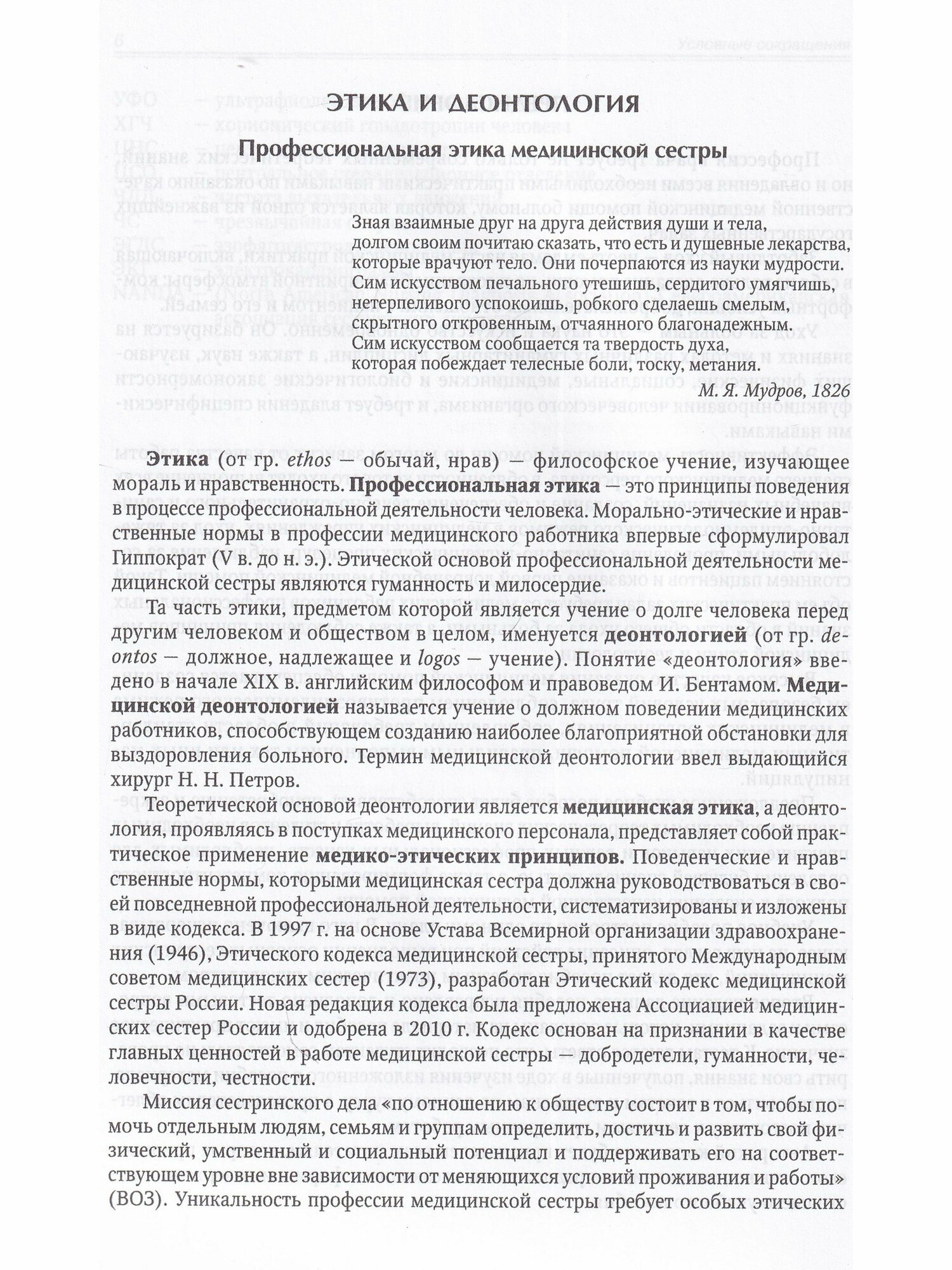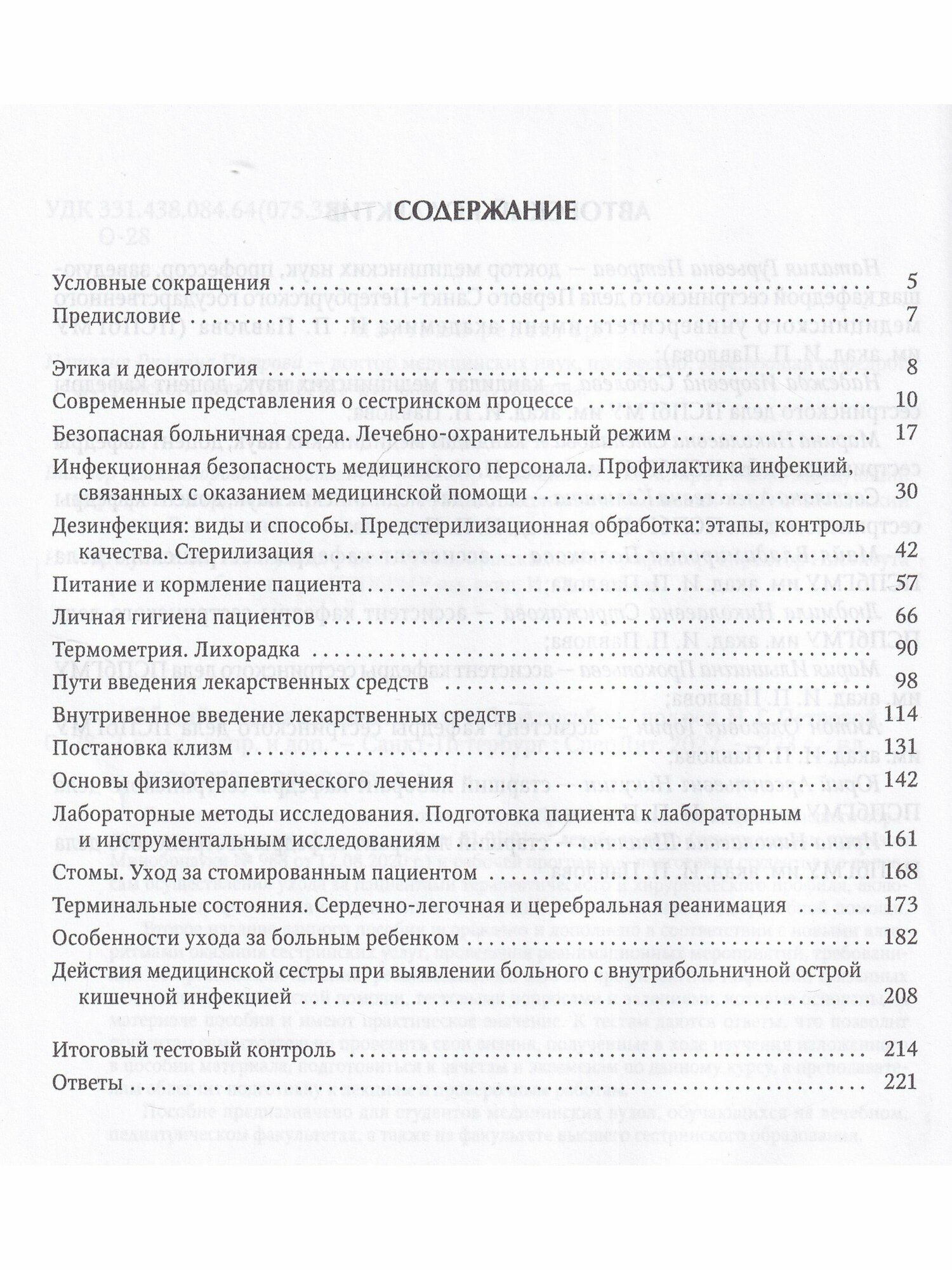 Второе издание данного пособия исправлено и дополнено в соответствии с новыми алгоритмами оказания сестринских услуг, проведения реанимационных мероприятий, требованиями по организации питания, рекомендациями ВОЗ по профилактике инфекций, связанных с оказанием медицинской помощи, тестовыми вопросами и заданиями, которые основаны на материале пособия и имеют практическое значение. К тестам даются ответы, что позволит студентам самостоятельно проверить свои знания, полученные в ходе изучения изложенного в пособии материала, подготовиться к зачетам и экзаменам по данному курсу, а преподавателям облегчит подготовку к лекциям и проверочным работам.