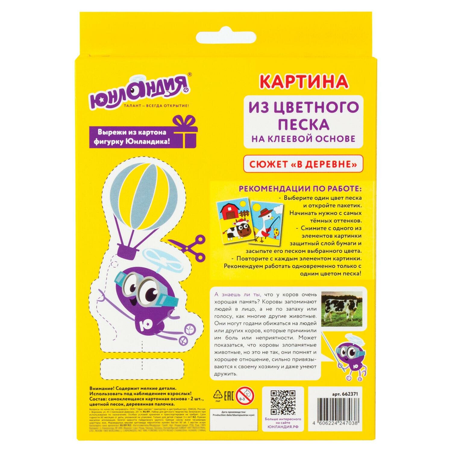 Картина из цветного песка ЮНЛАНДИЯ - это интересный способ развития мелкой моторики, цветового восприятия и фантазии ребёнка, а также блестящая картина своими руками! Для создания аппликации не требуются ножницы и клей, всё необходимое входит в набор.