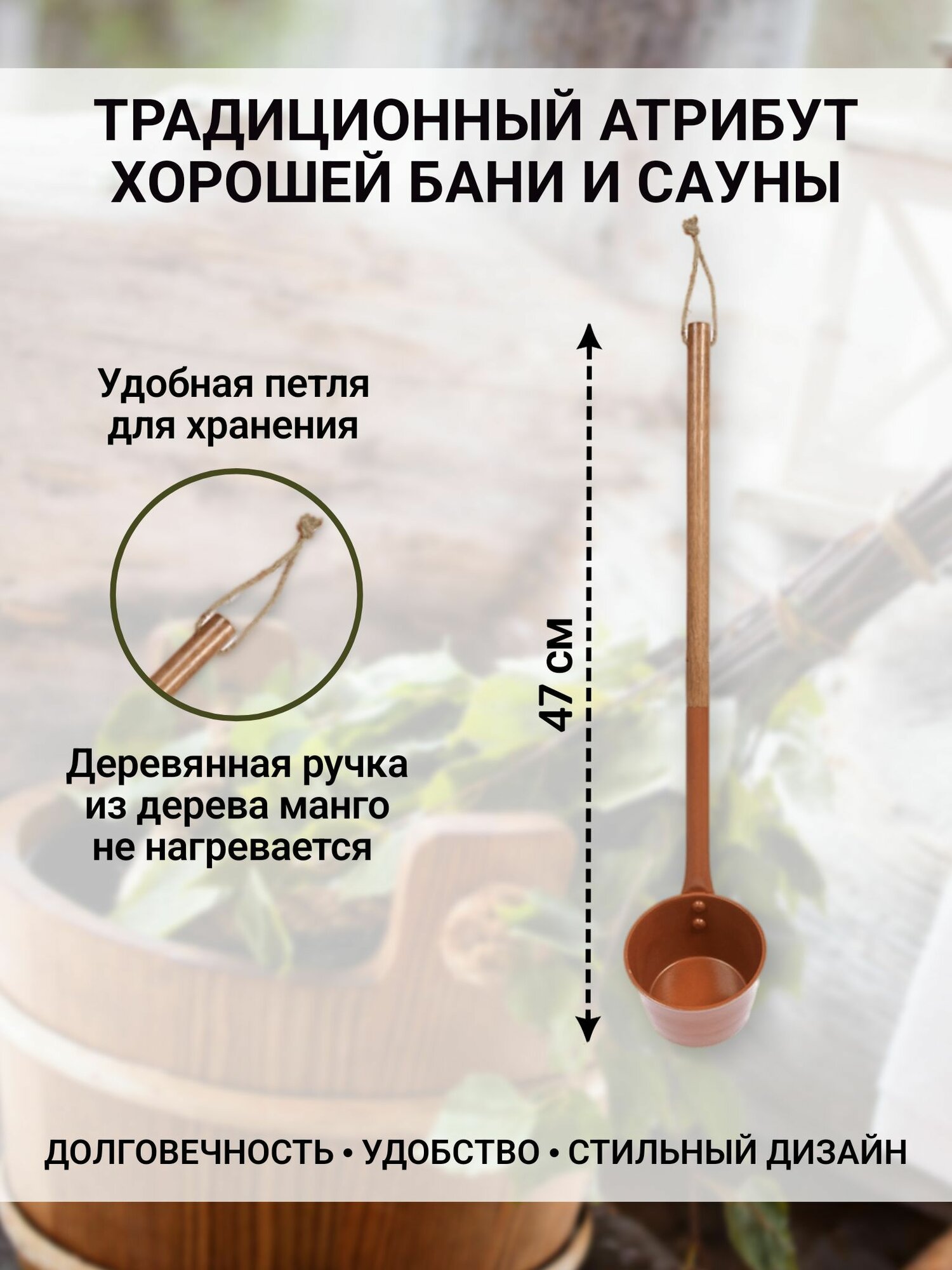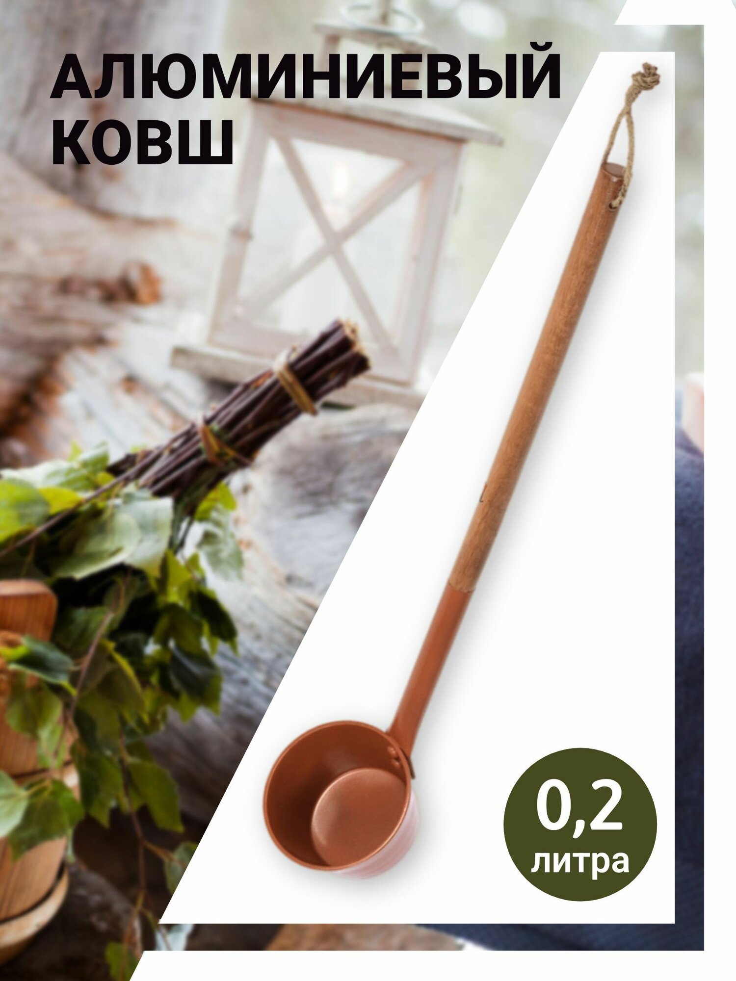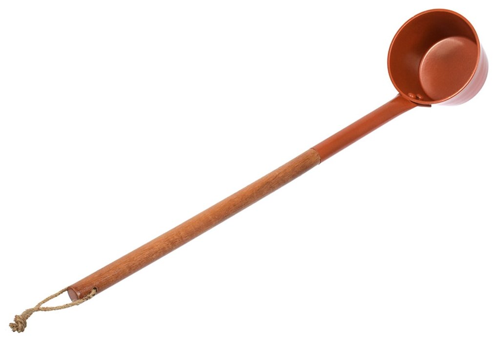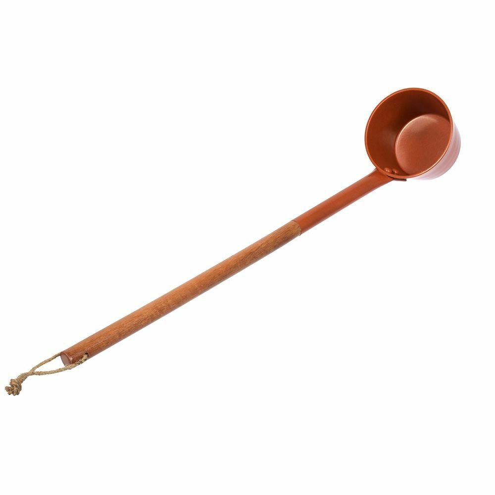 Ковш для бани алюминиевый, с деревянной ручкой, длина 47 см, объем 200 мл, терракотовый.В баню невозможно ходить без определенных атрибутов, которые стали уже традиционными. В их число входят ведра, бадьи, ковши из различных материалов - медь, алюминий, оцинкованная и нержавеющая сталь. Эти аксессуары уже считаются обязательными, и без них банная процедура будет неполной. В ведра и бадьях удобно замачивать веники, что очень пригодиться любителям попариться.