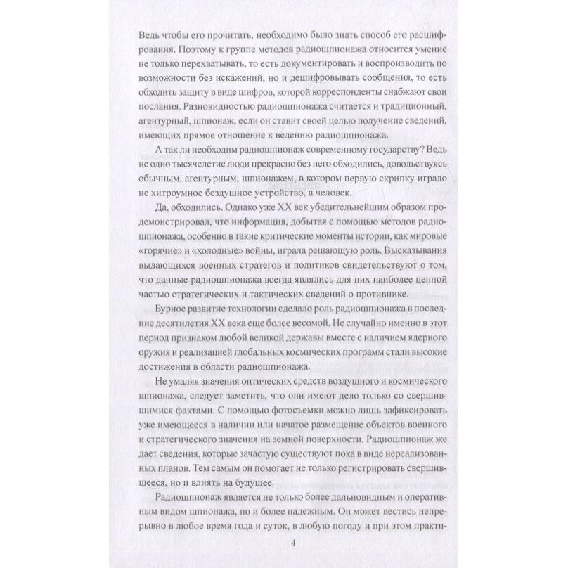Книга Бориса Анина, подполковника КГБ, много лет проработавшего в спецслужбах, посвящена истории мирового радиоэлектронного шпионажа - разновидности шпионской деятельности, заключающейся в получении секретной информации из каналов связи. Автор сообщает многие неизвестные факты военной истории. В книге собран огромный фактический материал по операциям всех крупных зарубежных спецслужб, в том числе подробно рассказано о работе спецслужб КГБ.