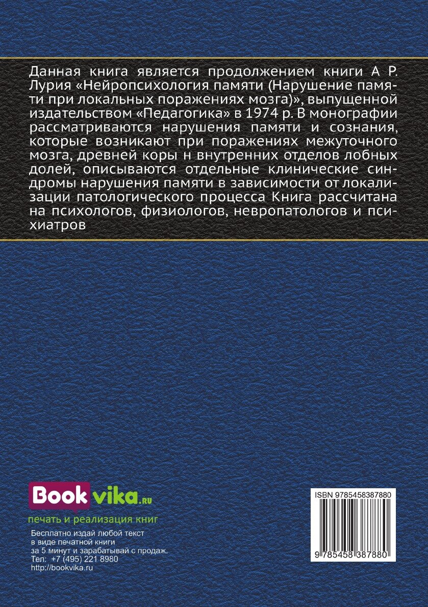 Данная книга является продолжением книги А Р. Лурия «Нейропсихология памяти (Нарушение памяти при локальных поражениях мозга)», выпущенной издательством «Педагогика» в 1974 р. В монографии рассматриваются нарушения памяти и сознания, которые возникают при поражениях межуточного мозга, древней коры н внутренних отделов лобных долей, описываются отдельные клинические синдромы нарушения памяти в зависимости от локализации патологического процесса Книга рассчитана на психологов, физиологов, невропатологов и психиатров.