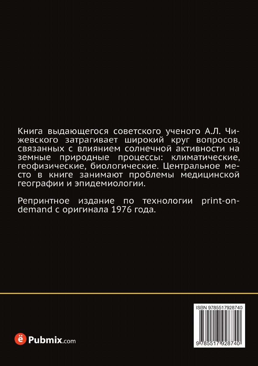 Книга выдающегося советского ученого А.Л. Чижевского затрагивает широкий круг вопросов, связанных с влиянием солнечной активности на земные природные процессы: климатические, геофизические, биологические. Центральное место в книге занимают проблемы медицинской географии и эпидемиологии.Репринтное издание по технологии print-on-demand с оригинала 1976 года.