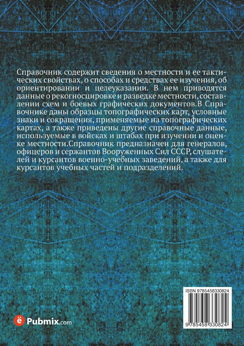 Справочник содержит сведения о местности и ее тактических свойствах, о способах и средствах ее изучения, об ориентировании и целеуказании. В нем приводятся данные о рекогносцировке и разведке местности, составлении схем и боевых графических документов.В Справочнике даны образцы топографических карт, условные знаки и сокращения, применяемые на топографических картах, а также приведены другие справочные данные, используемые в войсках и штабах при изучении и оценке местности.Справочник предназначен для генералов, офицеров и сержантов Вооруженных Сил СССР, слушателей и курсантов военно-учебных заведений, а также для курсантов учебных частей и подразделений.