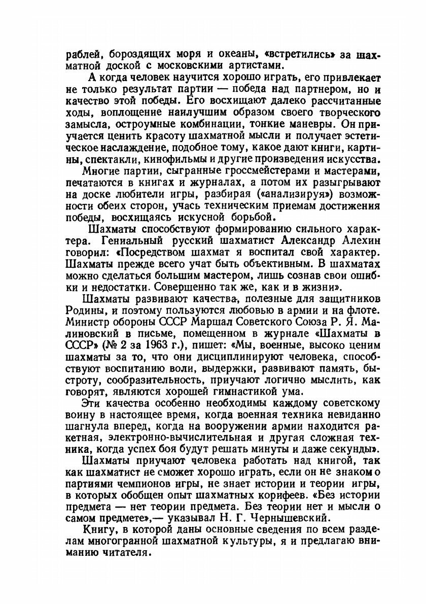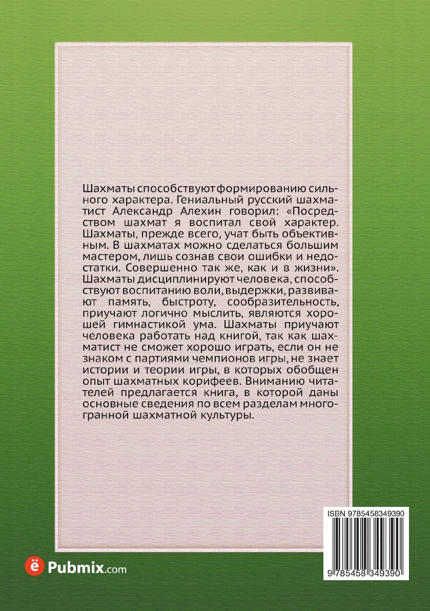 Шахматы способствуют формированию сильного характера. Гениальный русский шахматист Александр Алехин говорил: «Посредством шахмат я воспитал свой характер. Шахматы, прежде всего, учат быть объективным. В шахматах можно сделаться большим мастером, лишь сознав свои ошибки и недостатки. Совершенно так же, как и в жизни». Шахматы дисциплинируют человека, способствуют воспитанию воли, выдержки, развивают память, быстроту, сообразительность, приучают логично мыслить, являются хорошей гимнастикой ума. Шахматы приучают человека работать над книгой, так как шахматист не сможет хорошо играть, если он не знаком с партиями чемпионов игры, не знает истории и теории игры, в которых обобщен опыт шахматных корифеев. Вниманию читателей предлагается книга, в которой даны основные сведения по всем разделам многогранной шахматной культуры.