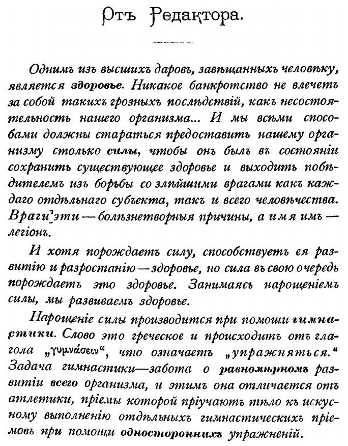 Говоря о системах физического развития прошедшего XX века никак нельзя обойти стороной систему выдающегося атлета Евгения Сандова. Не обладая с рождения богатырским телосложением, этот человек сумел добится прекрасных результатов в физическом развитии и дал миру гениально простую, но эффективную систему упражнений, по котрой занимался он сам и многие его последователи. Система Сандова разработана для людей различного пола и возраста и по своему предназначению задумана как средство укрепления здоровья. Вместе с тем отмечается, что она может быть использована и для тех, кто в будущем захочет стать известным атлетом. Евгений Сандов - это уникальная личность. Взглянув на фотографию, вы сразу же отметите потрясающую проработанность каждой мышцы, каждой жилки могучего тела Евгения Сандова. Да, Сандов не был огромен как медведь, однако нельзя сказать, что он был маленьким. Начиная заниматься по системе Евгения Сандова, любой атлет уже в скором времени начнёт ощущать "пробуждение" своего организма. Вы буквально чувствуете, как очередное упражнение пронизывает каждую вашу мышцу. Именно тщательная проработка отдельных мыщц - одно из важных достоинств системы Евгения Сандова. Другой очень значимый момент - мышцы нагружаются равномерно, каждодневно, никакой работы "до отказа". И как бы это не показалось странным с точки зрения современного бодибилдинга, система Сандова за счёт своей равномерности, постепенного увеличения нагрузок и многократных повторений даёт потрясающий результат в развитии силы и выносливости, хорошо укрепляет здоровье (если всё делать правильно) и, конечно, придает телу рельефность и красоту. Содержание: Действие физических упражнений Сокращаемость мышц Химические явления в мышцах Мышечная работа Расположение мышц Форма мышц при жизни Физиологическое сокращение мышц Действие антагонистов Об усилиях Правила при производстве физических упражнений Прогулки пешком Что такое прогулка и как её использовать Подробное описание упражнений и приёмов борьбы.