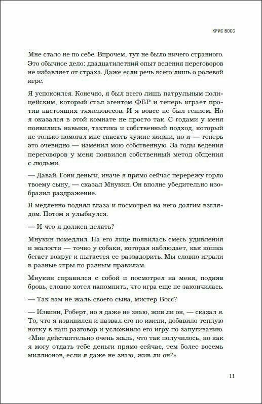 «Я не вижу особой разницы между террористом, взявшим в заложники людей, и агентом по недвижимости, который отчаянно пытается сбить цену на ваш дом», — утверждает Крис Восс на страницах своей книги. Те приемы, которые срабатывают в переговорах с первым, точно так же срабатывают и со вторым. Разница только одна: когда спасаешь заложников, не имеешь права останавливаться на полпути — соглашаться на освобождение, скажем, семи человек из десяти и гибель остальных. Ты должен всегда идти до конца. Добиваться абсолютной победы при любых раскладах. Книга «Переговоры без компромиссов» именно об этом.
