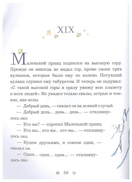 Я думаю, многие знакомы с этой мудрой повестью-сказкой и продолжают читать её своим детям или младшим братьям и сёстрам. Книга философская и поучительная, через метафоры и аллегории автор показывает нам, насколько важны в жизни человека такие понятия как любовь, дружба, верность. Читая ее, понимаешь, как важно иметь того, кого любишь и кто будет ждать тебя. У маленького принца это цветок - роза. Она хоть и капризна, но для него единственная и родная. Поэтому после всех путешествий по другим планетам, он торопится вернуться домой, к своей розе и трём вулканам. Самобытные иллюстрации от самого Экзюпери помогают ещё лучше погрузиться в эту удивительную историю. Тем, кто ещё не успел ознакомиться с этим произведением, советую к обязательному прочтению.