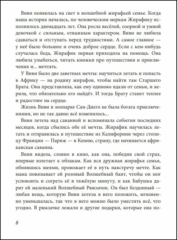 Как отличить обыкновенного жирафа от волшебного? О, это может быть совсем непросто! На первый взгляд Жирафик Виви выглядит, как обычный жирафёнок, но при этом умеет разговаривать на разных языках и… лететь! Виви преодолела множество препятствий, чтобы добраться из калифорнийского зоопарка в африканскую саванну и разыскать там своего Старшего Брата. А теперь ей пора собираться в обратный путь. Какие приключения ждут отважного и очень доброго Жирафика по дороге домой?