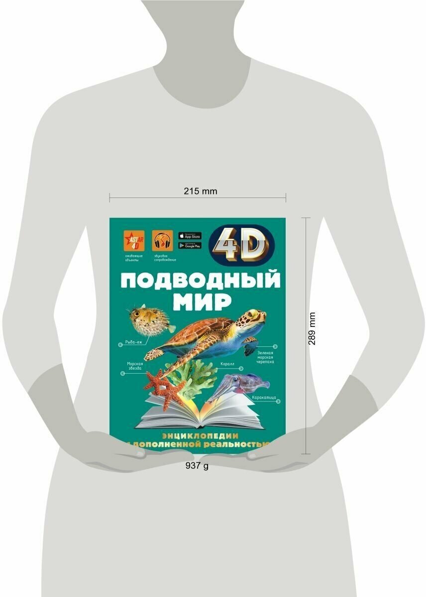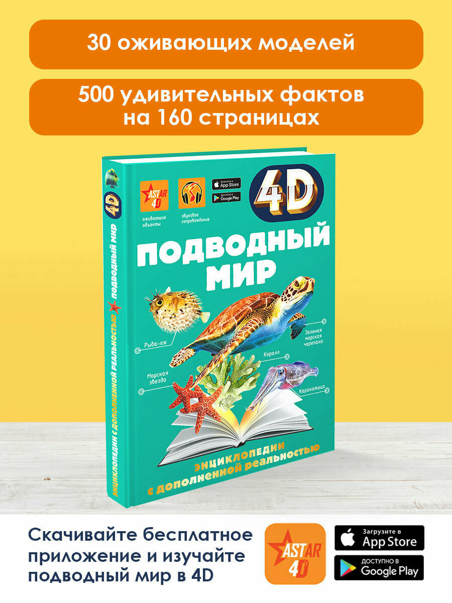 Эта 4D-энциклопедия с дополненной реальностью расскажет о таинственном и загадочном подводном царстве - месте, где когда-то зародилась жизнь. В наши дни океанские глубины изучены лишь на 5%, но и этого достаточно, чтобы познакомиться с его самыми красивыми и ужасающими, стремительными и медлительными, гигантскими и крошечными, смышлеными и не очень обитателями. 4D-анимации оживят на страницах книги и опасную акулу, и ловкого марлина, и крошечного морского конька, и прозрачную медузу. Каждая "живая" картинка сопровождается звукозаписью с познавательной и интересной информацией. Открой эту энциклопедию и узнай все об удивительных жителях подводного мира.