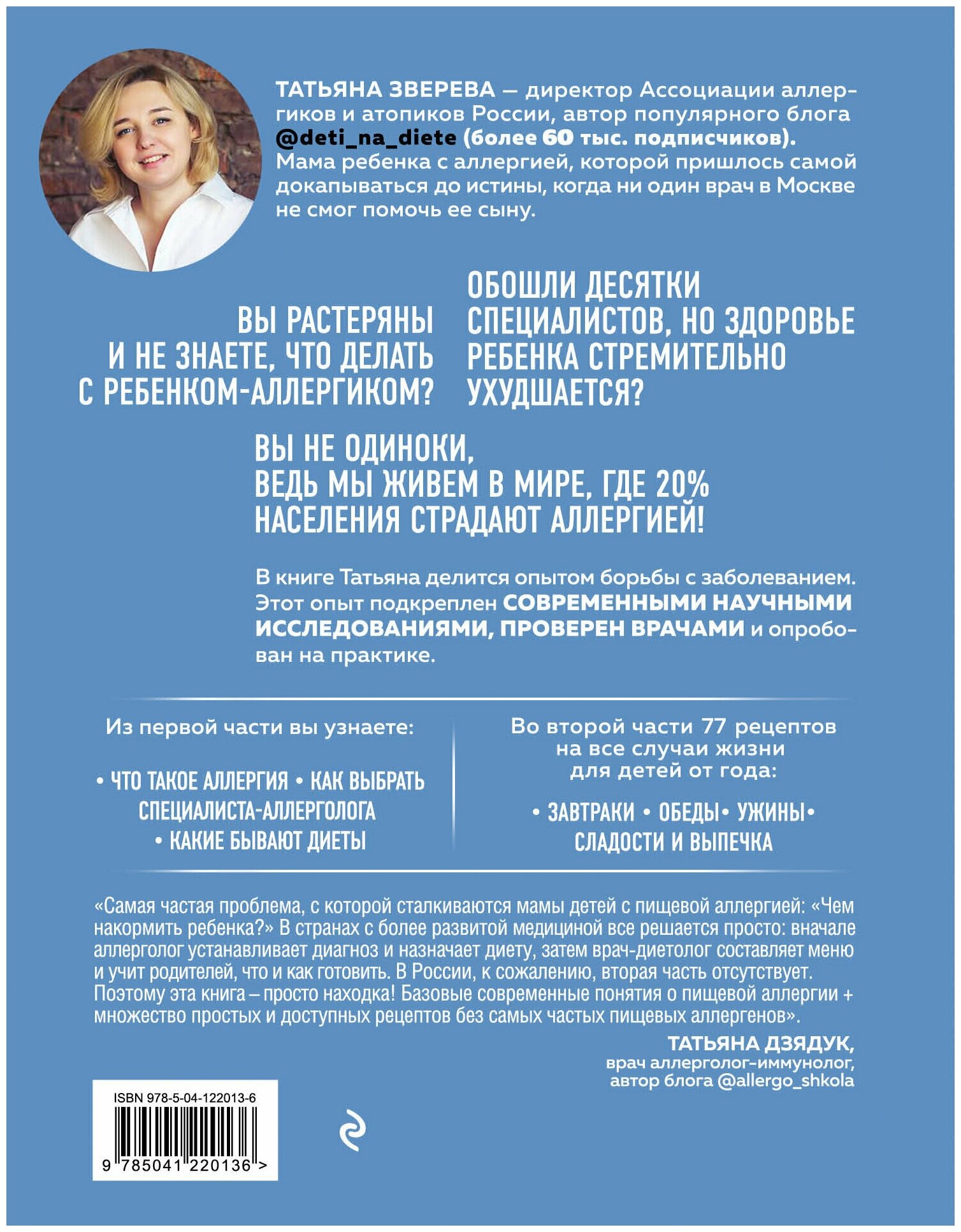 Очень полезная книга! Много простых в приготовлении рецептов, которые доказывают, что аллергия - это не приговор, даже с ней можно питаться полноценно и вкусно, не чувствуя себе обделенным и стиснутым в жесткие рамки диеты. Грамотная теоретическая часть с доказательной базой. Книга помогает не поддаться панике ( к которой склонны многие родители), успокоиться и здраво взглянуть на возможные варианты решения проблемы.