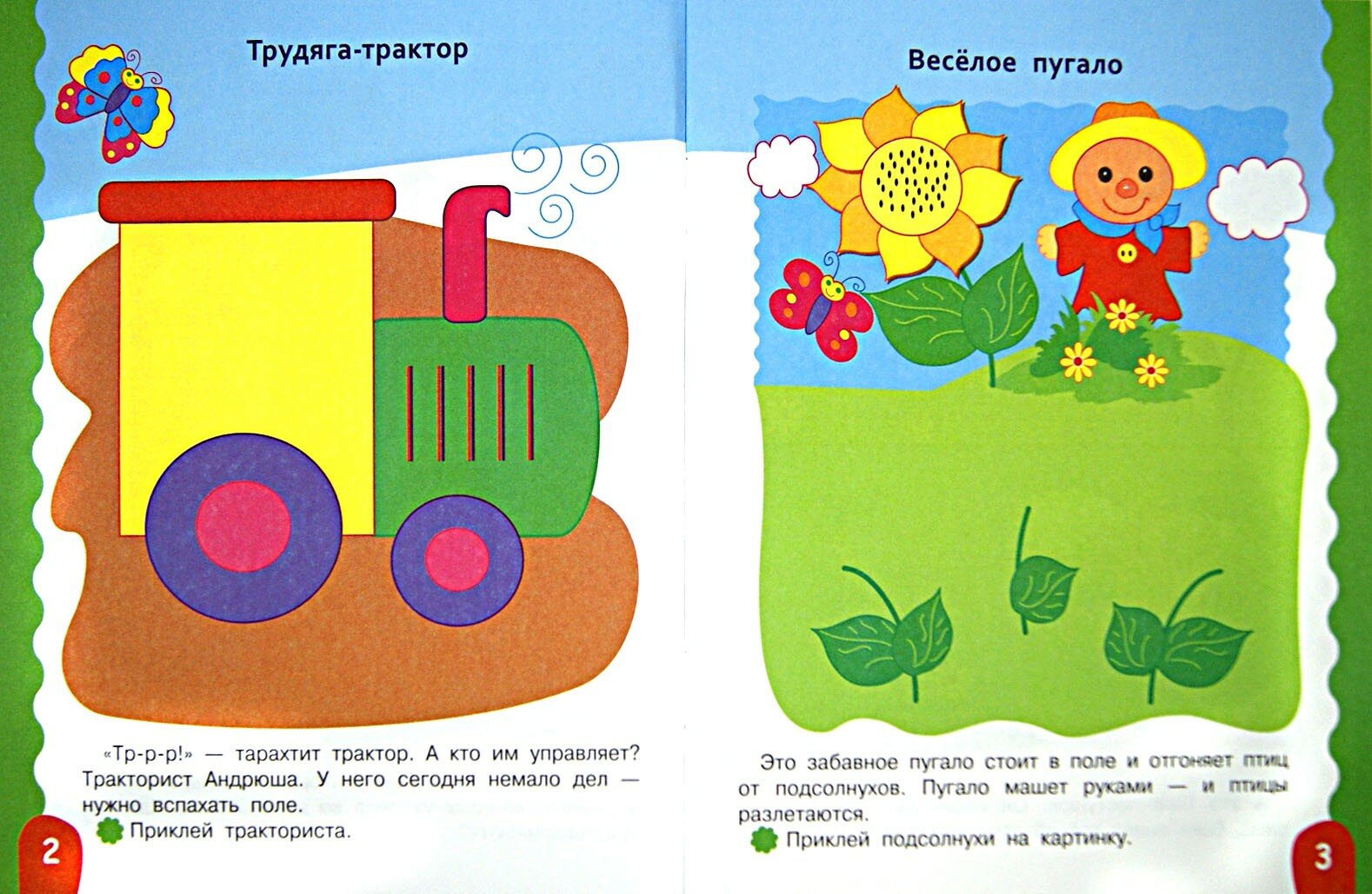 Книжка тоненькая, в ней 6 тем: деревенский дворик, трудяга-трактор, веселое пугало, на лугу, на пруду, в огороде и в саду. В середине - наклейки, разделенные по темам, которые и нужно разместить по своим местам. Внизу страниц - пара предложений текста, и указание, какие наклейки нужно клеить. Сами наклейки не многоразовые.
