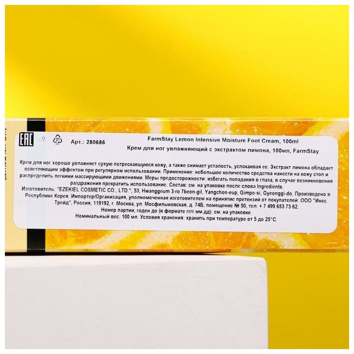 Крем для ног увлажняющий с экстрактом лимона Lemon intensive FarmStay 100мл Myungin Cosmetics Co., Ltd (1665260)