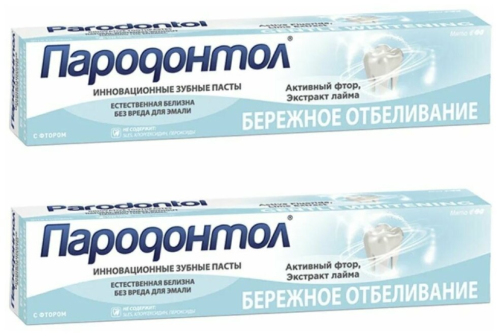 Пародонтол Зубная паста " Бережное отбеливание" предназначена для поддержания естественной белизны зубов, укрепления эмали и защиты от кариеса. Специально подобранный уникальный комплекс активных компонентов: способствует сохранению естественной белизны зубной эмали защищает от образования зубного камня заботится о здоровье десен укрепляет эмаль и защищает от кариеса Активный фтор препятствует образованию кариеса, укрепляет зубную эмаль, обеспечивает защиту от сахарных кислот . Экстракт лайма - способствует поддержанию здоровья десен. Не содержит: SLES, хлоргексидин, пероксиды, агрессивные отбеливающие и абразивные компоненты. В комплекте 2 штуки.