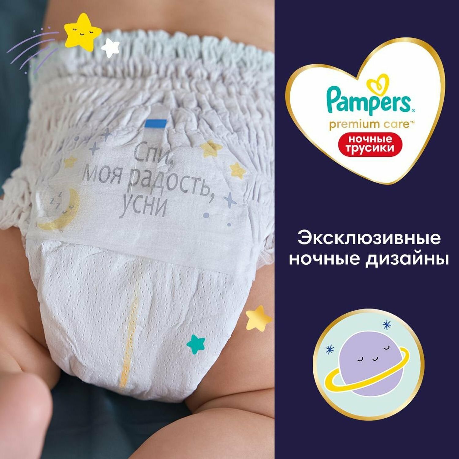 Pampers Premium Care: ночные трусики наши 1 по мягкости и защите на всю ночь. Они дарят непревзойденный комфорт благодаря новому мягкому и дышащему верхнему слою Airsoft, который защищает нежную кожу малыша от контакта с влагой. Благодаря усиленному впитыванию трусики обеспечивают дополнительную защиту кожи от влаги* и комфорт кожи на всю ночь. Их мягкие двойные бортики вокруг ножек надёжно защищают от протеканий на всю ночь. А ещё ночные трусики Pampers Premium Care не содержат отдушек!* по сравнению с трусиками Premium Care. Ночные Трусики Pampers Premium Care наши трусики 1 по мягкости и защите на всю ночь. (по сравнению с трусиками Premium Care). Мягкий и дышащий верхний слой Airsoft защищает нежную кожу малыша от контакта с влагой. Благодаря усиленному впитыванию трусики обеспечивают дополнительную защиту кожи от влаги* и комфорт кожи на всю ночь. Двойные мягкие бортики вокруг ножек защищают от протеканий. 0% отдушек. Индикатор влаги. Стильные ночные дизайны. Легко надевать одним движением. Легко снимать: просто разорвите трусики по боковому шву. Легко утилизировать: просто сверните и закрепите лентой-липучкой