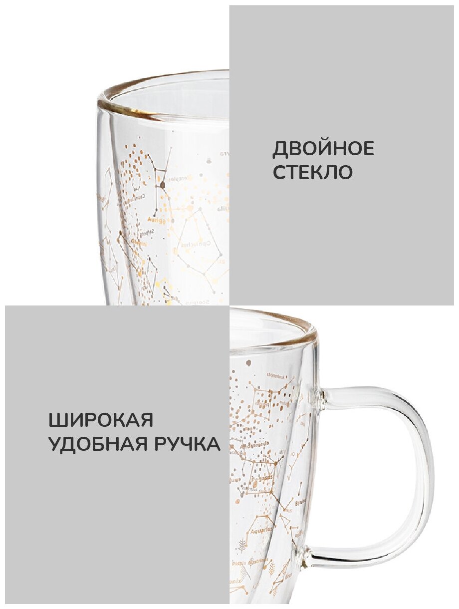 Кружка с двойными стенками выполнена из боросиликатного стекла и предназначена для подачи холодных и горячих напитков. Стенки термобокала не нагреваются, обеспечивая комфорт и безопасность использования. Благодаря двойным стенкам, стакан долго сохраняет температуру горячих или холодных напитков. Термокружка подходит для чая, кофе, горячих напитков, для холодных напитков, кружка для дома, для работы. Кружки с двойным стеклом с золотым рисунком - это прекрасный подарок.
