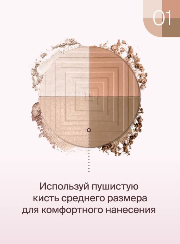 | Способ применения | Используй пушистую кисть для нанесения. На обороте палетки есть подсказка как правильно нанести оттенки.Рекомендуется использовать после нанесения тонального средства и/или пудры.Для нанесения воспользуйся пушистой кистью среднего размера. Скульптор (soft brown) нанеси на скуловую зону, крылья носа, височные впадины, контуры лица и мягко растушуй вдоль линии роста волос. Румяна (Natural) нанеси на яблочки щек и мягко растушуй по направелнию к виску. Хайлайтером (Light) подсвети выступающие части лица. Более темный Хайлайтер (Sunny) нанеси на верхнюю линию скул, мягко сглаживая переход с румянами.Хранить при температуре 5 - 25 градусов. |
