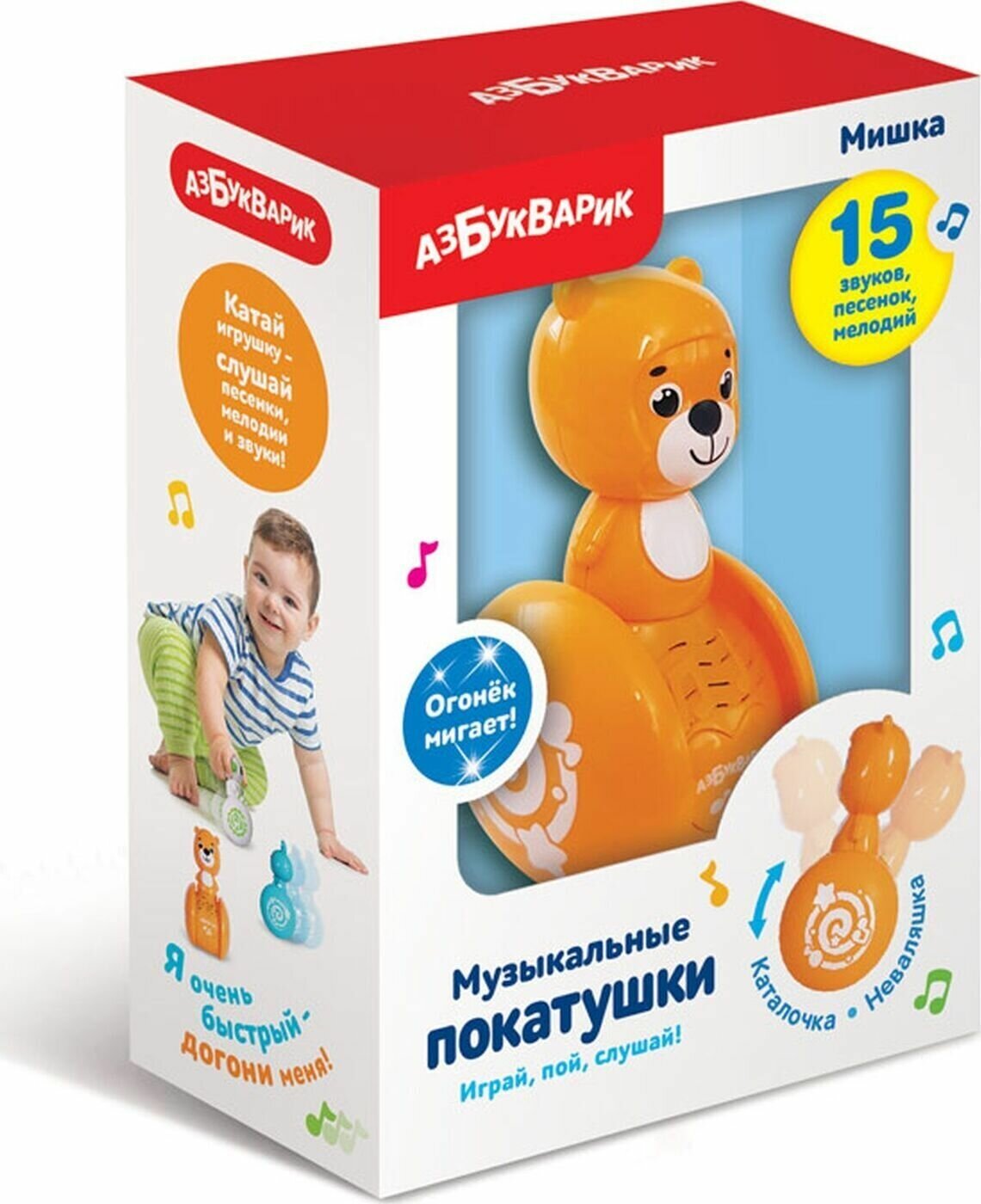Мишка 4680019283609 Музыкальные покатушки Комплектация: игрушка - 1 шт. Материал: пластик Размер: 14*8*11 см. Функционал: интерактивная, содежит звуковые элементы, световые эффекты, неваляшка, песенки ("Ладушки", "Топ-топ, топотушки"), мелодии ("Калинка", "Чижик-пыжик") и веселые звуки Возраст: 3+ Упаковка: картонная коробка с дисплеем Страна происхождения бренда: Россия Оригинальная яркая музыкальная игрушка с различными функциями - прекрасный подарок малышу. Она предназначена для активных игр и развития мелкой моторики и координации движений. Яркая расцветка развлечет малыша и привлечет его внимание. Игрушка учит пониманию причинно-следственной связи, помогает тренировать моторику и координацию движений, восприятие формы и цвета. Музыкальная игрушка оборудована кнопками, нажимая на которые можно прослушать мелодии. Работает от батареек. Игрушка привлекает внимание и способствует развитию тактильного, зрительного и слухового восприятия малыша. Игрушки сделаны из прочного и безопасного материала.