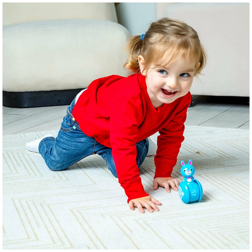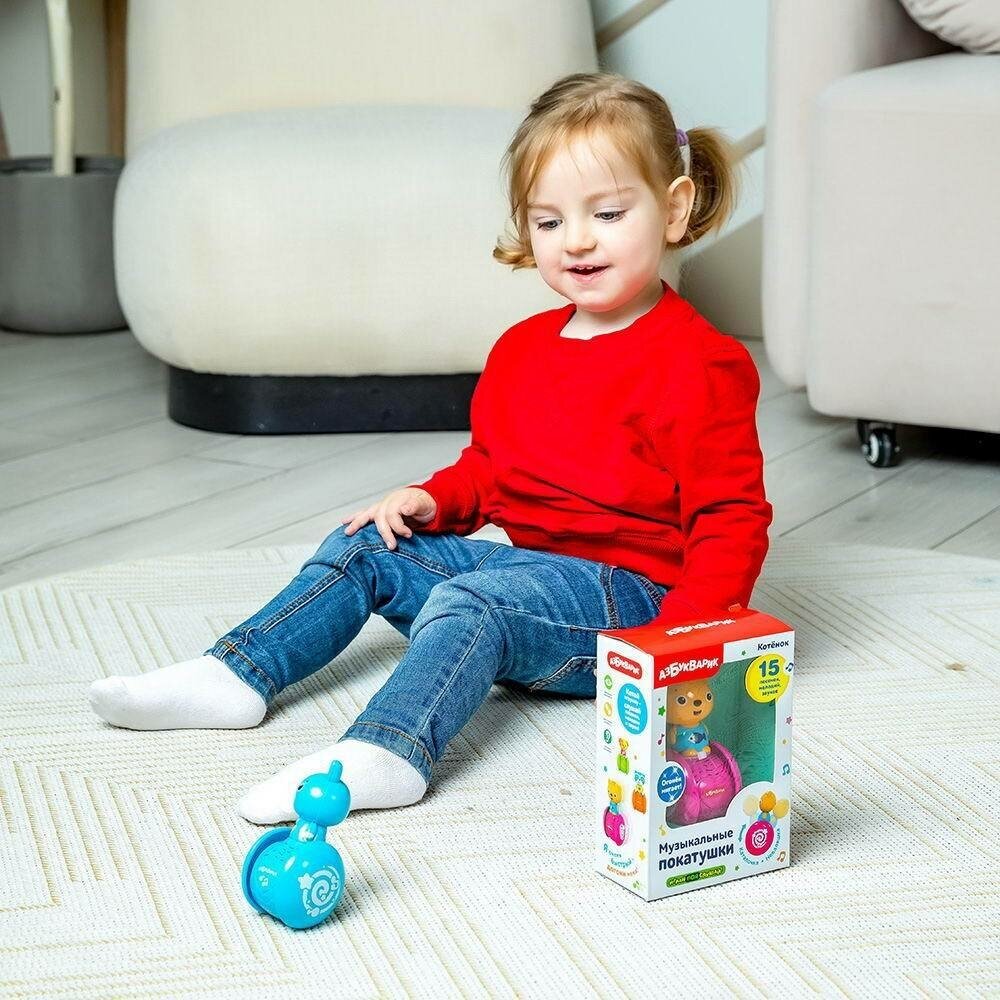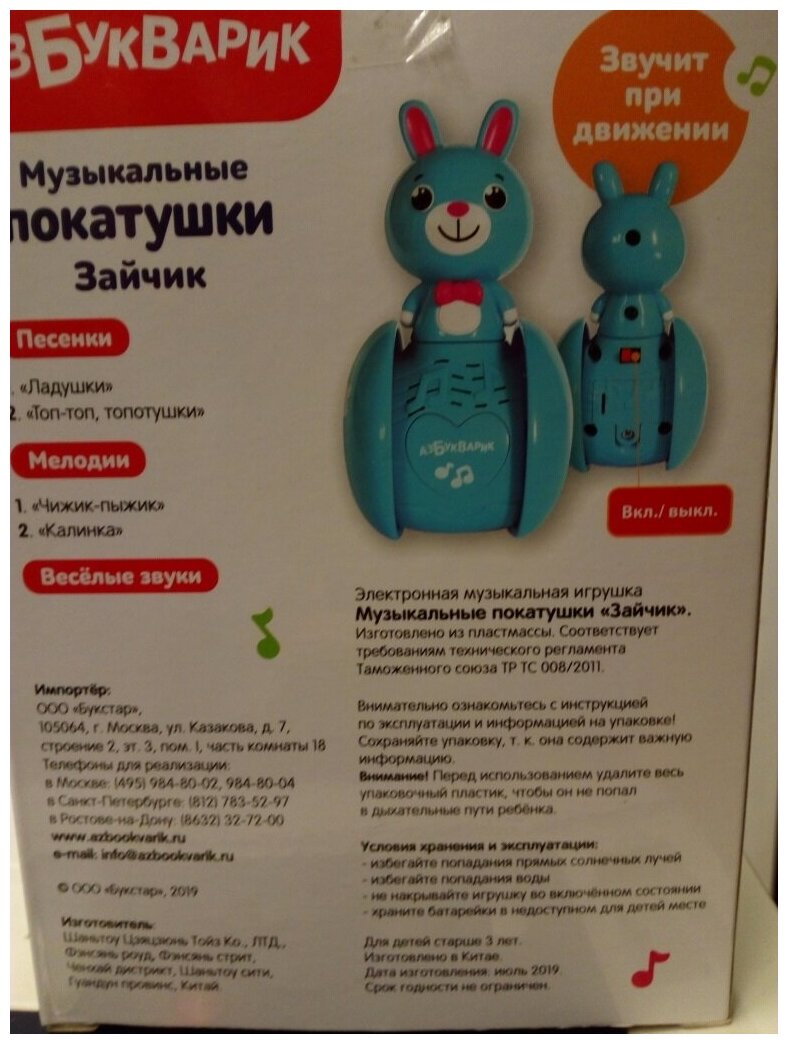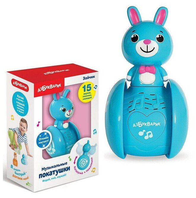 Музыкальная игрушка Азбукварик «Музыкальные покатушки. Зайчик». Этот забавный зайчик на колесиках такой быстрый – попробуй догони! Катай игрушку – слушай песенки («Ладушки», «Топ-топ, топотушки»), мелодии («Калинка», «Чижик-пыжик») и веселые звуки. А еще с зайчиком можно играть, как с неваляшкой. Особенности: Электронная музыкальная игрушка из пластмассы. Рекомендована для малышей 1-2 лет. Веселый музыкальный зайчик - прекрасный способ занять малыша в дороге или дома. Интерактивная игрушка улучшает слуховое, зрительное и тактильное восприятия, отлично развивает мелкую моторику и координацию движений ребенка. Работает на 3AG13/LR44 батарейках (в комплекте демонстрационные). 15 песенок, мелодий и звуков.
