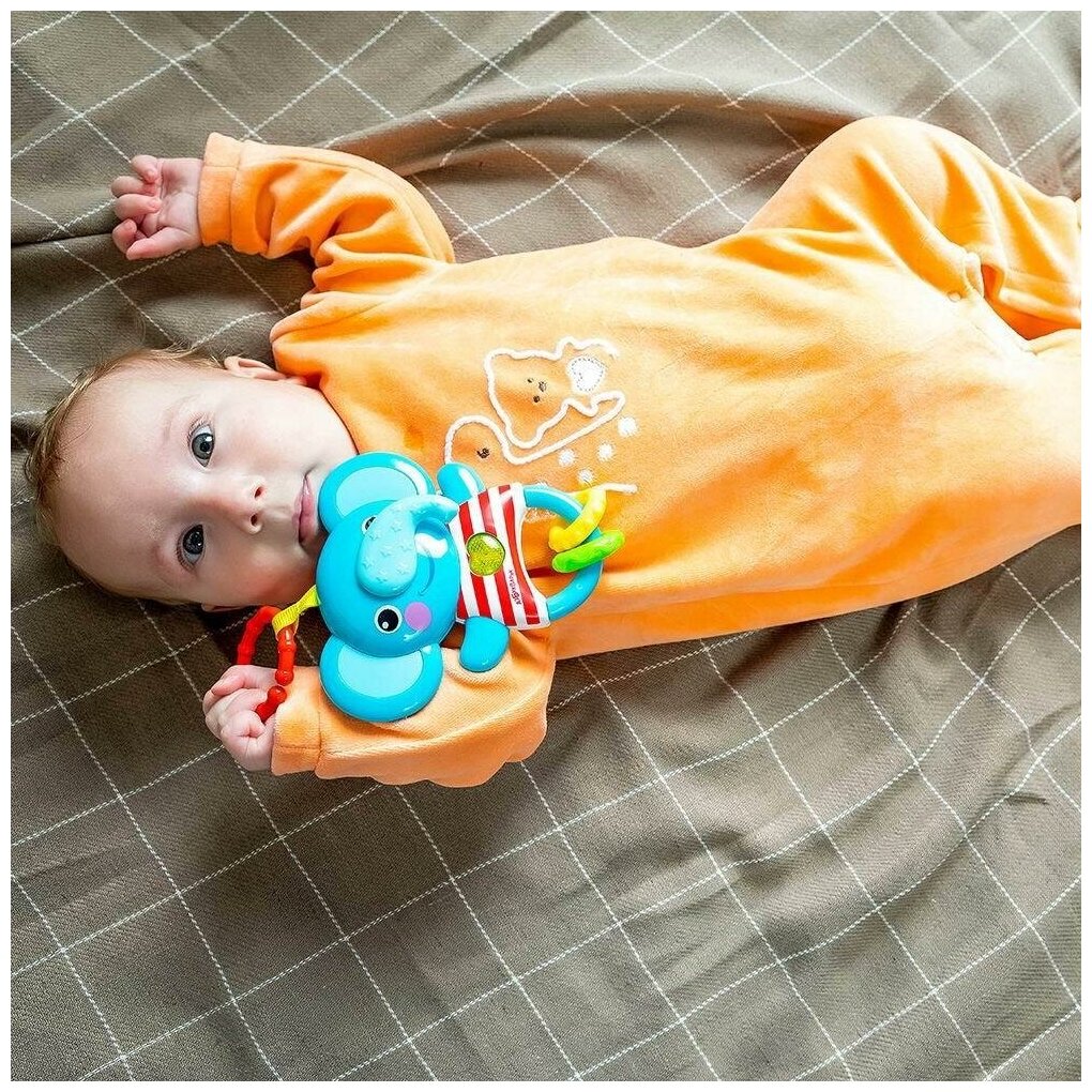 Яркая музыкальная подвеска для малыша в виде модного слоненка! При нажатии на кнопочку ребенок сможет послушать веселые звуки, 5 песенок и мелодий(«Раз-два-три», «Тра-ля-ля», «Танец зверят» и др.). В игрушке много активных элементов, помогающих в развитии органов чувств. Хобот слоненка крутится и издает забавный звук трещотки, рельефные колечки развивают мелкую моторику, кнопочка с огоньком привлекает внимание. Подвеска удобно крепится на кроватку или коляску с помощью колечка.