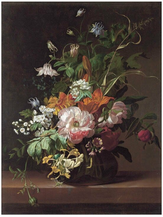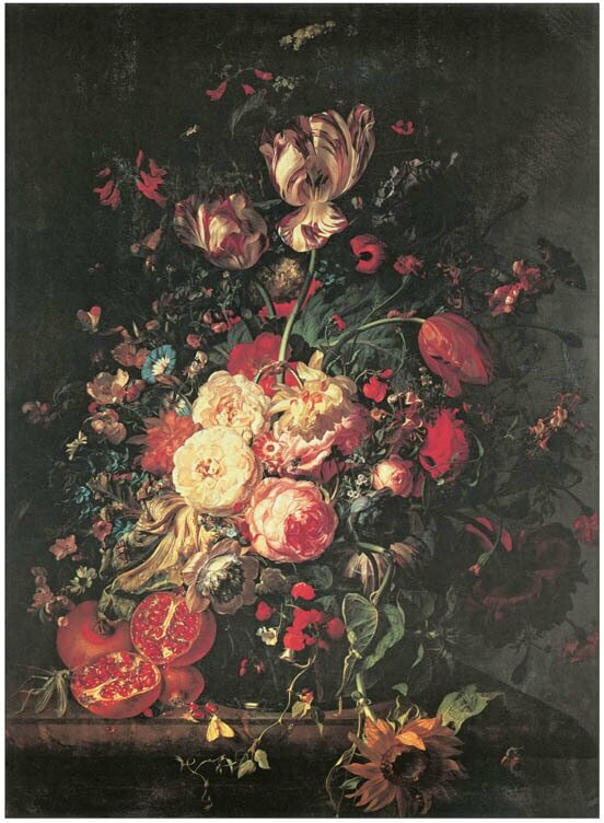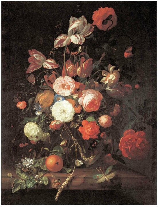 Голландская художница Рахель (Ракель) Рейш писала великолепные цветочные натюрморты. Ее отец, анатом и ботаник, был профессором в университете Амстердама. Помощь отцу в составлении коллекций не оставила ее равнодушной к прекрасному миру цветов. Скоро она станет ученицей знаменитого Виллема ван Алста, который учил ее искусству живописи. Долгое время она пребывала при дворе курфюрста Пфальца Иоганна Вильгельма в качестве придворной художницы, радуя всех, кто любил цветы, тонким колоритом и тщательной проработкой деталей.