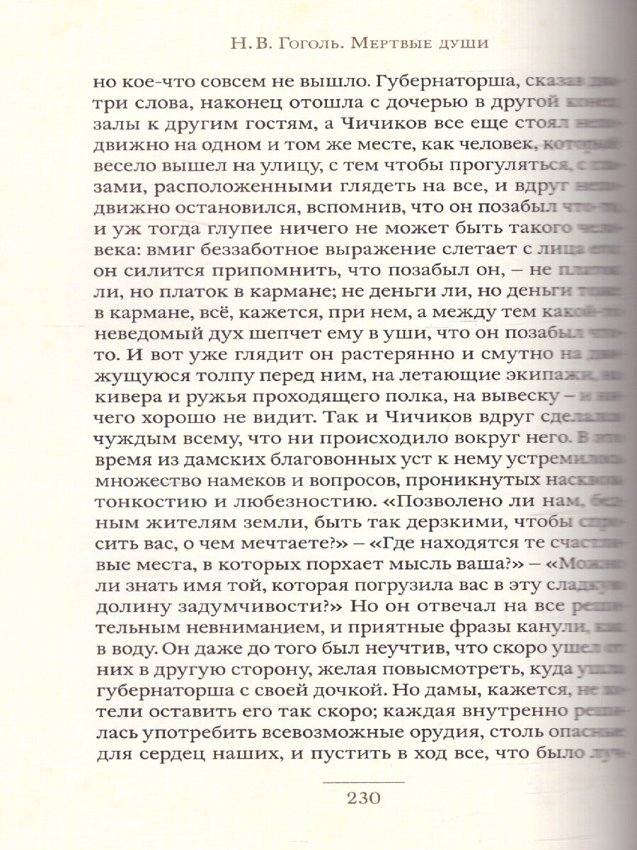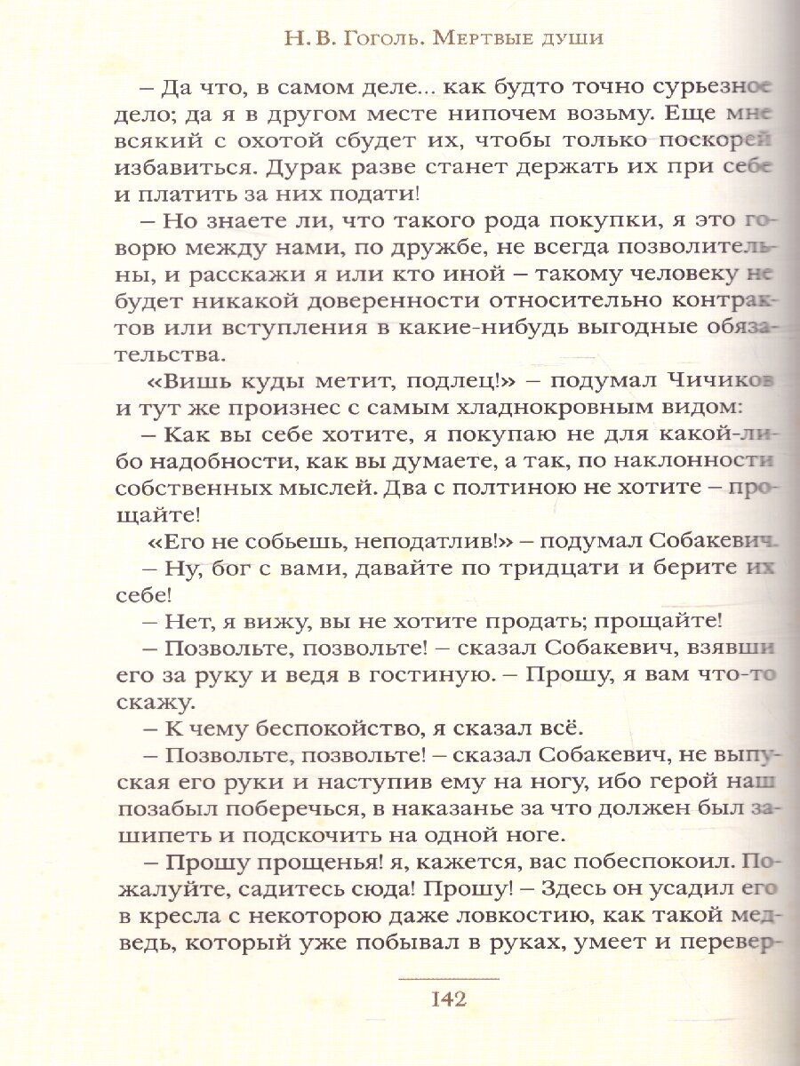 В произведении Гоголя описан быт крепостной России,жителей и суть общества. Автор смешивает юмор и сатиру с глубоким философским размышлением,мастерски обличая пороки,раскрывает характер персонажей,задает вопросы о смысле человеческого существования,нравственности и ценностям. Оформление книги на высшем уровне: бумага, шрифт, картинки, ляссе. Удобно брать с собой. Рекомендую к покупке.