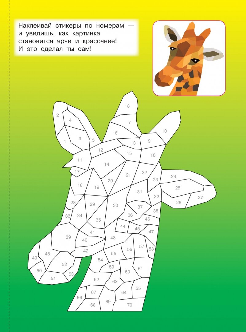 "Животные" - самая настоящая волшебная книжка для юных художников. Это красочные иллюстрации + более 1000 геометрических стикеров. Ребята узнают, что рисовать можно не только карандашами, фломастерами или красками, но и наклейками. Получаются картинки с 3D-эффектом! Достаточно подобрать наклейки по номерам. Ребёнок удивится и обрадуется, когда животные на страницах станут красочными и объёмными. Юным художникам обязательно понравятся интересные задания на развитие логики, памяти, внимания, мелкой моторики.