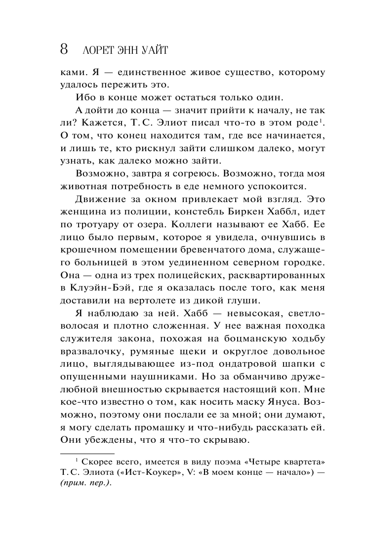Интересный детектив с сюжетом, который держит в напряжении. Действительно, сюжет перекликается с романом "Десять негритят", он неоднократно упоминается в книге, но здесь сюжет более жесткий. Написано хорошим языком, читается легко, красивые описания северной природы. Довольна книгой.