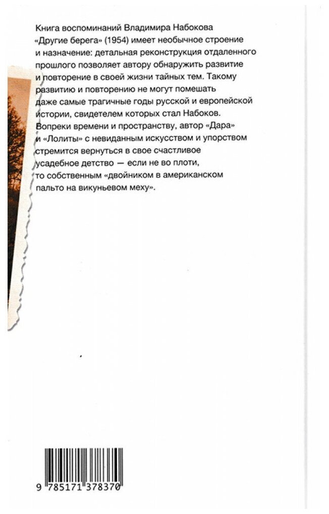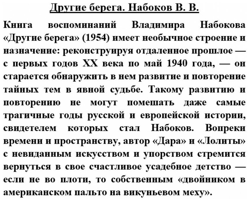 Владимир Владимирович Набоков – русский писатель 20 века с самым популярным произведением «Лолита». Тем не менее, редко издаваемая книга под названием «Другие берега» также интересна. Оформление обложки выполнено в твердом, полностью матовом и очень приятном на ощупь переплете. Страницы – белые, шрифт четкий и комфортный для глаз.
