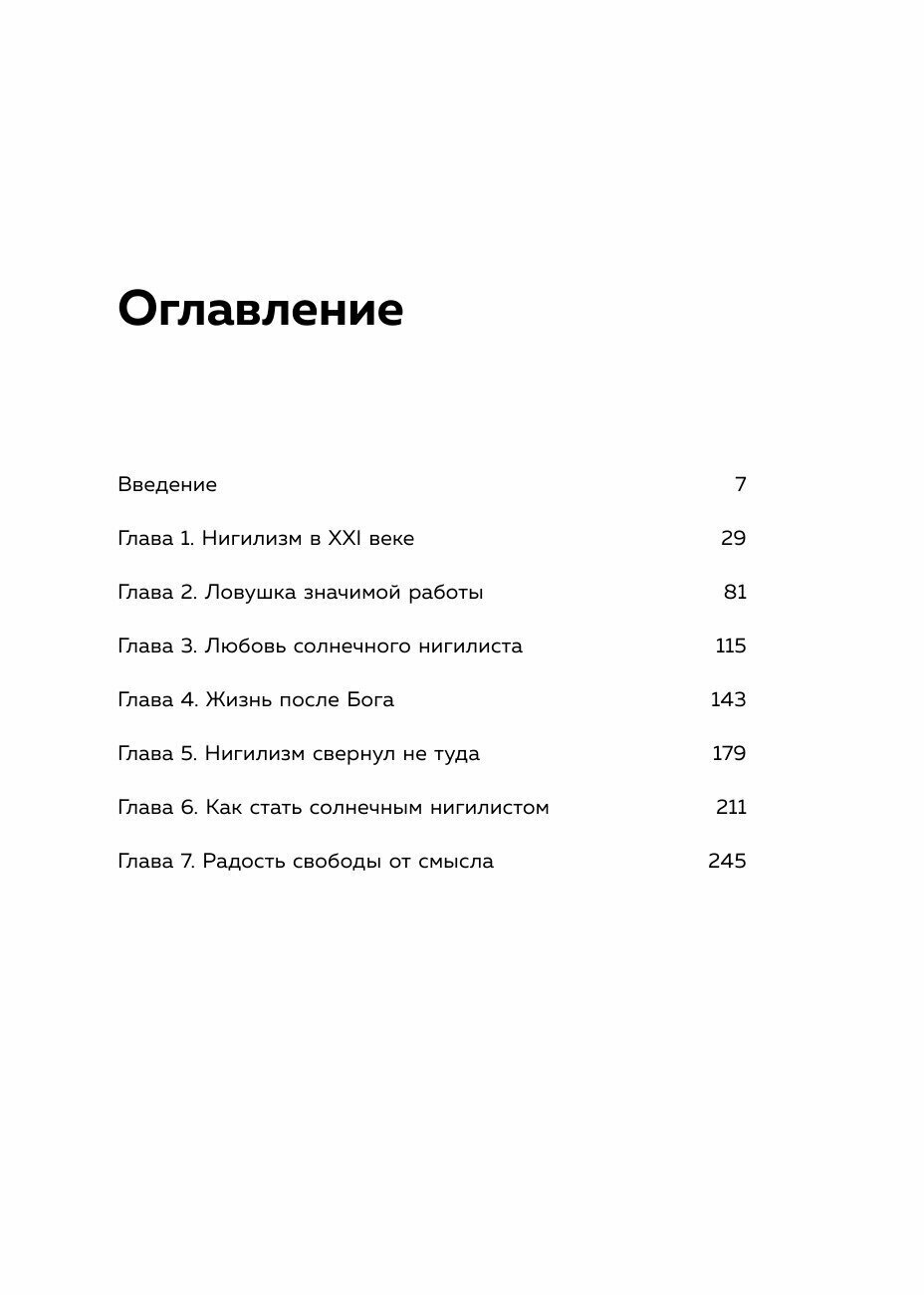 У автора очень интересный взгляд на философию нигилизма! Если честно, никогда не задумывалась, насколько эта теория применима к нашему времени, но после книги стала все чаще руководствоваться принципами, о которых узнала благодаря этому произведению. И вообще как-то по-новому взглянула на современные тенденции: никогда не думала, что поп-песни и всеобщее настроение тесно связаны с нашей усталостью от попыток найти некий «смысл». В общем, действительно получила удовольствие от прочтения.