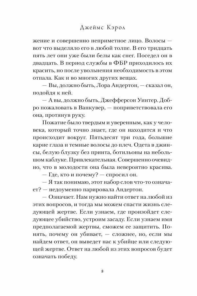 Очень затягивает и погружает в запутанный мир убийцы и высококлассных полицейских. Книга держит в напряжении до самого конца, и сама концовка вызывает бурю эмоций. Очень оригинальный убийца, который хитер и коварен, и не менее высокоинтеллектуальный инспектор сойдутся в битве за очередную жертву. Персонажи вызывают чувства сопереживания и уважения. Рекомендую всем любителям остросюжетных детективов.