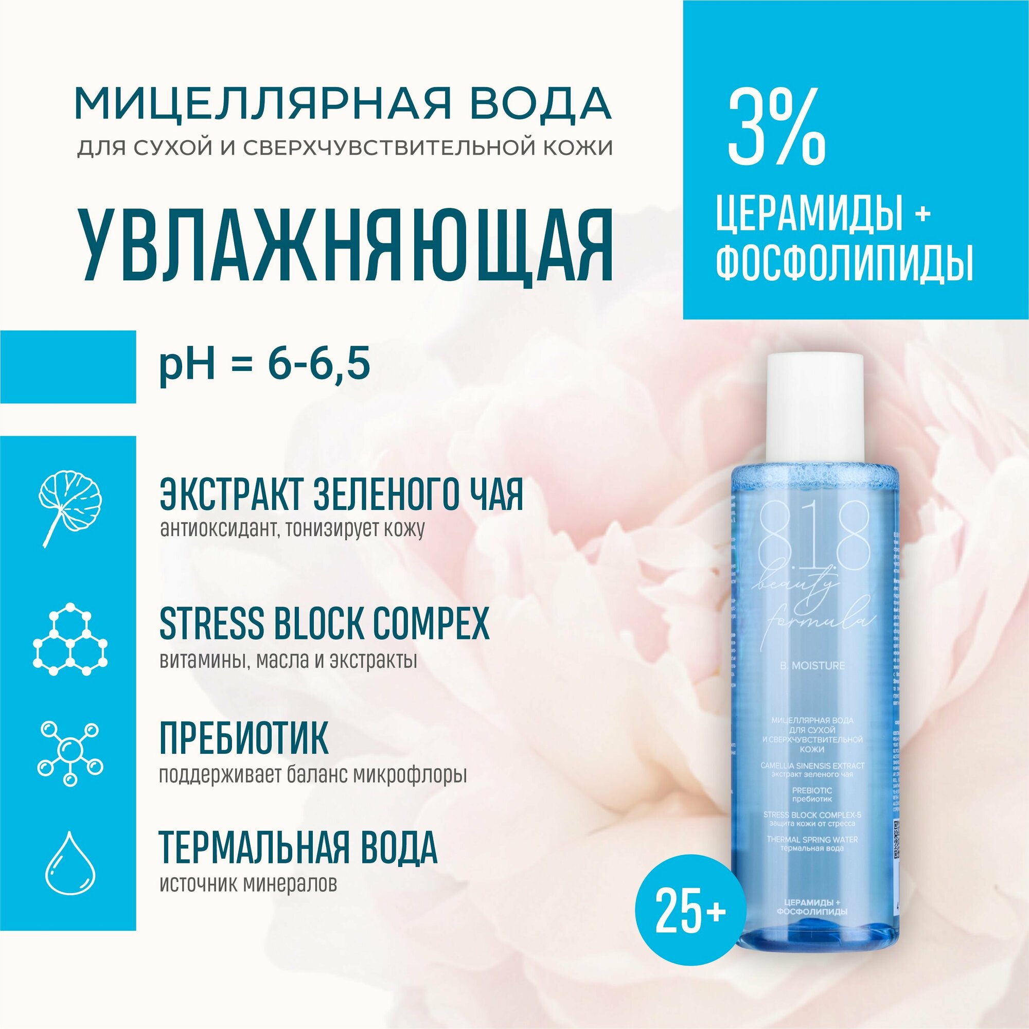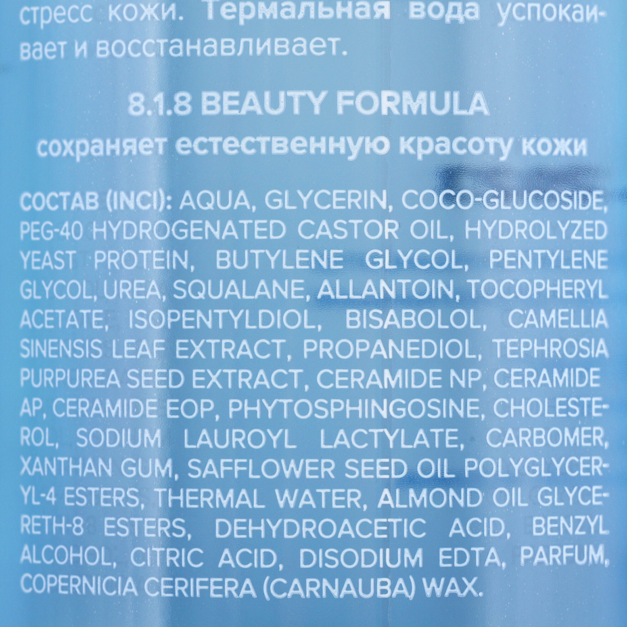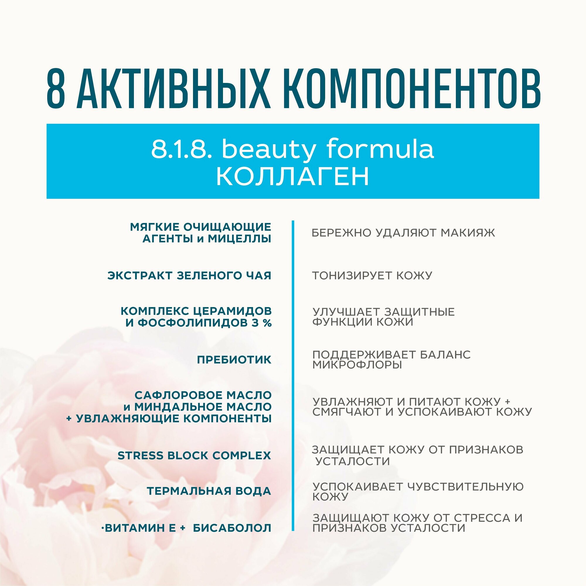 8.1.8 BEAUTY FORMULA - трехфазная система профилактики и защиты кожи от стресса. Восстанавливает эпидермальный ресурс. Омолаживает кожу. Создана для чувствительной кожи женщин мегаполиса, испытывающих дефицит сна и отдыха. Мицеллярная вода обеспечивает ежедневный уход за сухой и сверхчувствительной кожей. Деликатно и эффективно очищает кожу от загрязнений. Бережно удаляет макияж с лица и глаз. Успокаивает чувствительную кожу. Увлажняет. МИЦЕЛЛЫ бережно удаляют загрязнения и макияж, не нарушая гидролипидный барьер. САФЛОРОВОЕ МАСЛО и МИНДАЛЬНОЕ МАСЛО в водорастворимой форме увлажняют и питают кожу.УВЛАЖНЯЮЩИЕ КОМПОНЕНТЫ (аллантоин, мочевина, оливковый сквалан) смягчают и успокаивают кожу. - ЭКСТРАКТ ЗЕЛЕНОГО ЧАЯ обладает антиоксидантным действием, тонизирует кожу. КОМПЛЕКС ЦЕРАМИДОВ И ФОСФОЛИПИДОВ улучшает защитные функции кожи. Восстанавливает липидный каркас рогового слоя. ПРЕБИОТИК на основе гидролизата дрожжей поддерживает баланс микрофлоры. ТЕРМАЛЬНАЯ ВОДА успокаивает чувствительную кожу. ВИТАМИН Е улучшает синтез коллагена и эластина, повышает упругость и эластичность кожи. STRESS BLOCK COMPLEX-5 на основе семян пурпурной тефрозии снижает комплексное негативное влияние различных видов стресса на кожу. БИСАБОЛОЛ обладает антисептическими и противовоспалительными свойствами. Для сухой и сверхчувствительной кожи. Не содержит парабены, красители, спирт. Гипоаллергенно. 8.1.8 BEAUTY FORMULA сохраняет естественную красоту кожи.