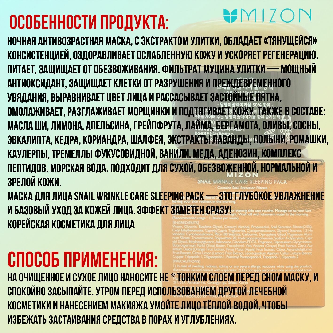Ночная маска для лица — придает сияние и повышает упругость кожи. Экстракт муцина улитки — выравнивает цвет. Масло арганы, масло ши и экстракт из меда — питают и увлажняют, комплекс пептидов в составе замедляет появление морщин. Подходит для сухой, обезвоженной, нормальной и зрелой кожи. Рекомендуется использовать 1-2 раза в неделю.