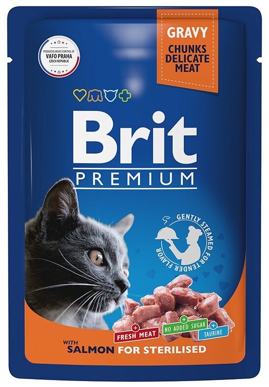 Нежные кусочки лосося в ароматном соусе - идеальное сочетание для полноценного и сбалансированного рациона. Паучи Brit Premium однозначно заинтересуют вашу кошку и станут для нее любимым блюдом. Влажный корм содержит все необходимые витамины и минералы, которые необходимы стерилизованному питомцу. Таурин в составе – важный ингредиенты для поддержания остроты зрения и здоровья сердечно-сосудистой системы кошек.