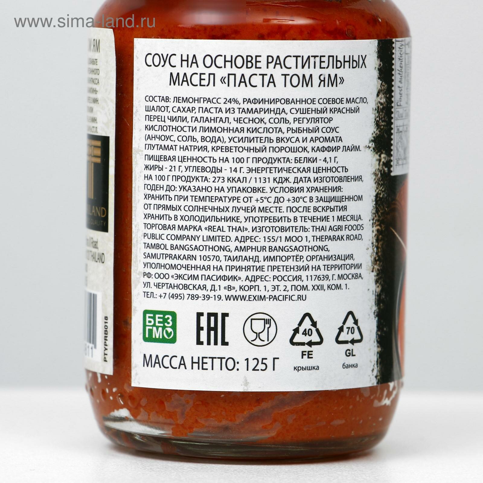 | Состав | соль, сахар, галангал 17%, лемонграсс, рафинированное соевое масло, перец чили, каффир лайм, усилитель вкуса и аромата глутамат натрия, регулятор кислотности лимонная кислота |
