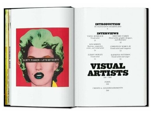 В книге представлены 450 обложек и записей художников с 1950-х годов до наших дней, в которых исследуется, как модернизм, поп-арт, концептуальное искусство, постмодернизм и различные формы современного искусства повлияли на эту побочную область визуального производства и поддержали массовое распространение. музыки с определяющими образами, которые быстро и многозначительно вызывают слуховую встречу. По пути мы находим городские иероглифы Жана-Мишеля Баскии для его собственного лейбла Tartown, трафаретные граффити Бэнкси для Blur и бабочку Сальвадора Дали на вертеле в фильме Джеки Глисона «Одинокое эхо». Наряду с обложками есть проницательный анализ и информационные бюллетени с указанием исполнителя, исполнителя, названия альбома, лейбла, года выпуска и информации об оригинальном оформлении. Интервью с Таубой Ауэрбах, Шепардом Фейри, Ким Гордон, Кристианом Марклеем, Альбертом Оленом и Рэймондом Петтибоном добавляют личные отчеты о совместных отношениях между артистами и музыкантами.