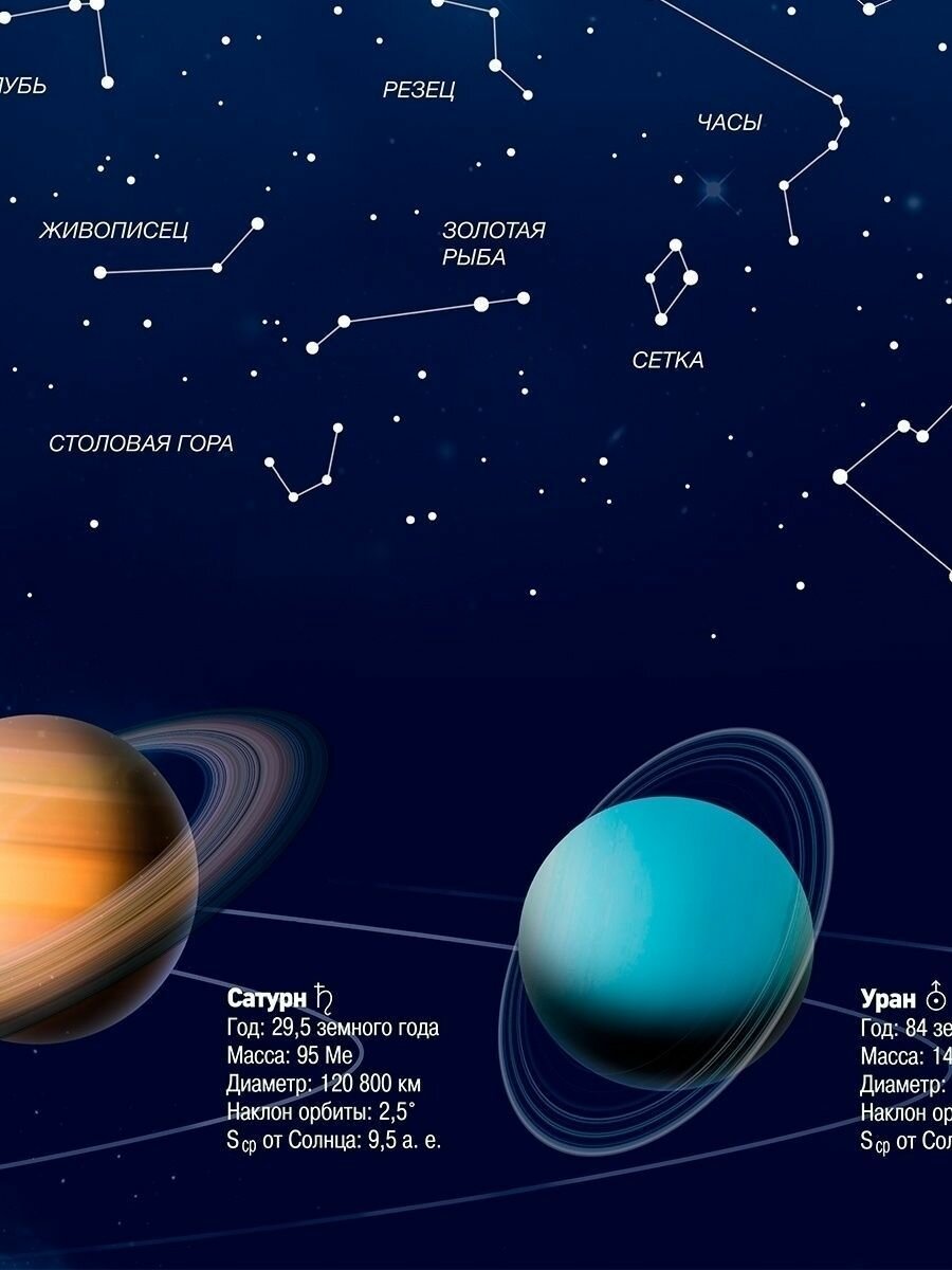 Перед вами необычная карта звёздного неба. Днём с ней можно исследовать очертания созвездий и названия ярчайших звёзд, а ночью же - просто наслаждаться звёздным сиянием. На карте отображены планеты по мере удаленности от Солнца, и изложена информация с краткими характеристиками каждой из них.