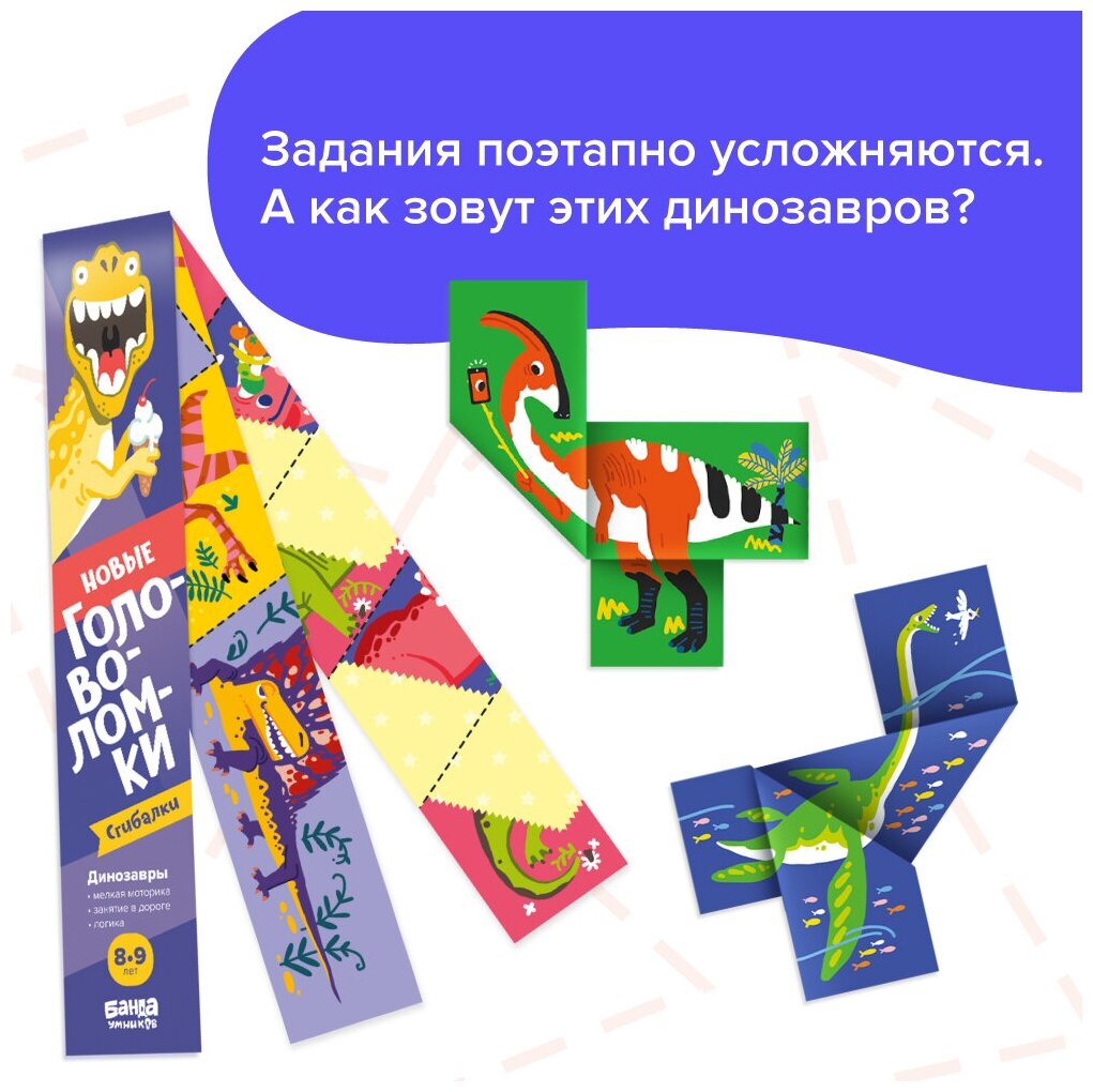 Сгибалки "Динозавры, от 8 лет". Эта головоломка для ребят 8-9 лет. В ней каждый лист нужно согнуть до четырёх раз. У ребёнка формируется понимание отношений между предметами путём наложения, совмещения, перегруппировки "кусочков" картинки с обожаемыми всеми динозаврами.