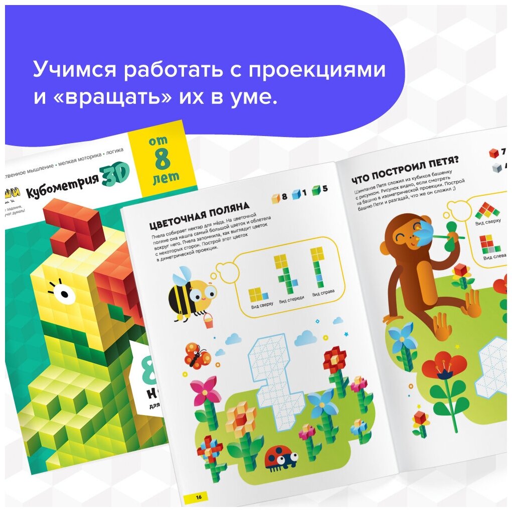 Тетрадь "Кубометрия, от 6 лет". В тетрадях "Кубометрия 3D" предстоит строить из кубиков, но не из обычных, а нарисованных. Работая с тетрадью "Кубометрия 3D от 6 лет", дети разбираются с видами проекций кубиков и развивают трёхмерное мышление, то есть способность "вращать" предмет в своей голове.