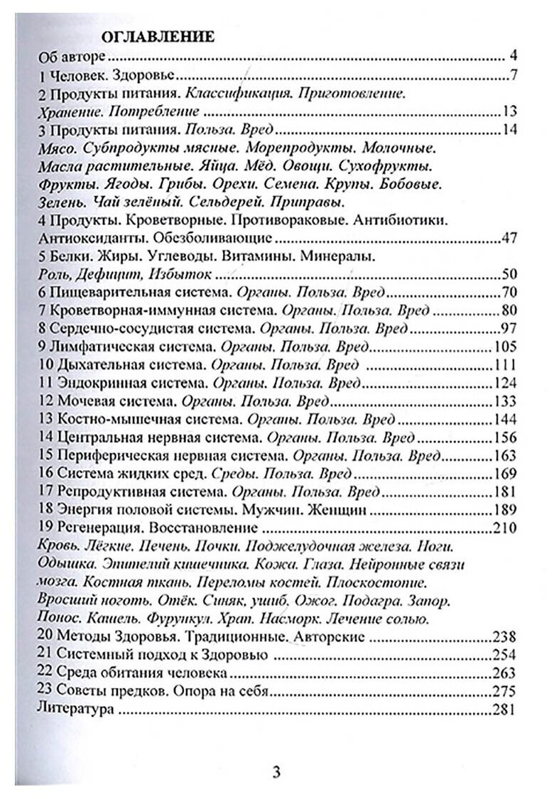 Книга содержит системный подход к здоровью человека; научно-практический опыт поддержания здоровья с помощью продуктов питания, без лекарств; беспрецедентные результаты оздоровления автора и других людей. Автору удалось избавиться от тяжёлых заболеваний и болей; улучшить показатели крови, которые были за пределами нормы. Книга может быть полезна человеку в профилактике, улучшении здоровья и жизнедеятельности.