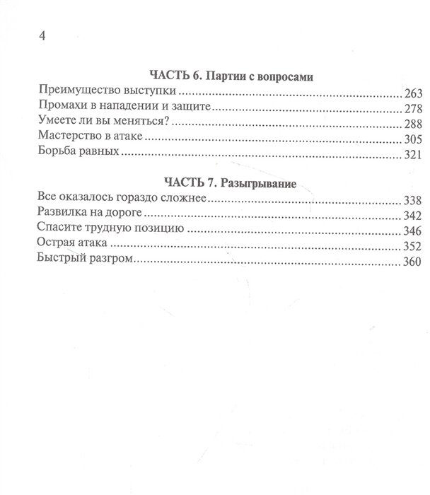 Книга состоит из семи частей: Уроки одной партии, Позиционные партии, Дебютные дискуссии, Король в опасности, Под обстрелом, Партии с вопросами, Разыгрывание. Читатель вправе выбрать для изучения те разделы, которые его больше всего интересуют. А можно сконцентрироваться на чисто практической тренировке, решая упражнения. Последние две части книги посвящены специфическим формам тренировки, которые автор регулярно использует на своих занятиях: разбор партий в форме решения серии последовательных задач и разыгрывание специально подобранных позиций.