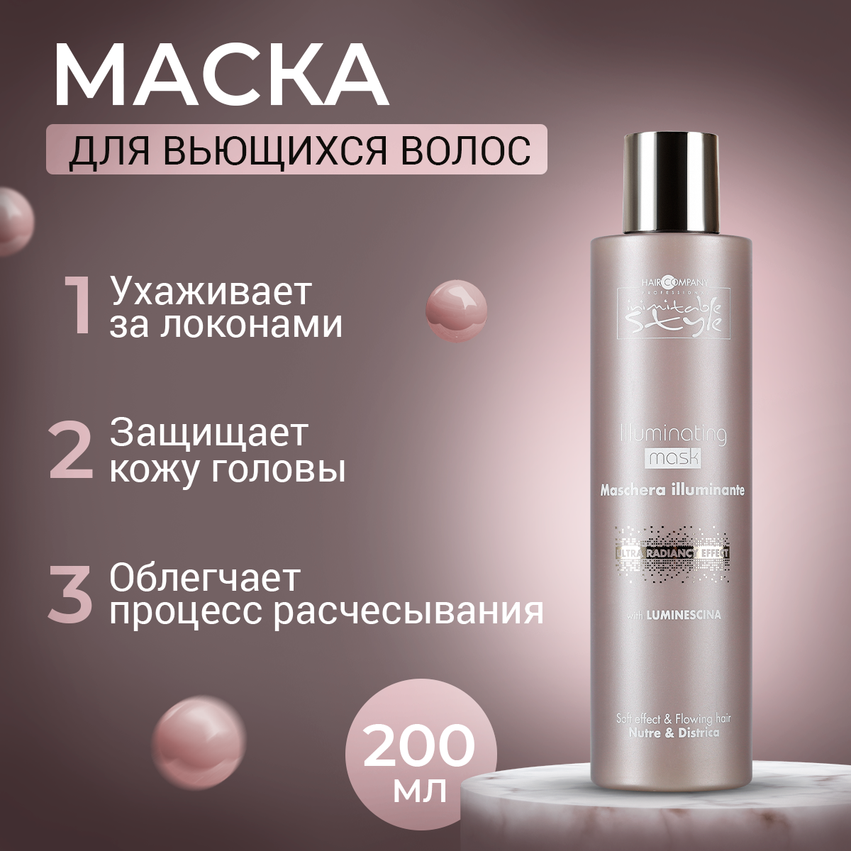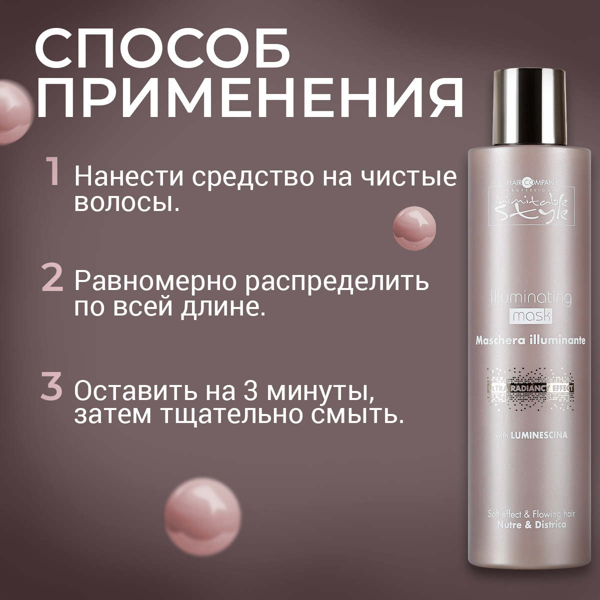 Отличительной особенностью продукта является низкий уровень pН, что позволяет препарату воздействовать на волосы мягко и бережно. Маска, придающая блеск, великолепно увлажняет уставшие и безжизненные волосы, а также защищает кожу головы, которая, безусловно, также нуждается в правильном уходе. После разового использования маски волосы становятся мягкими, сильными, эластичными и шелковистыми.