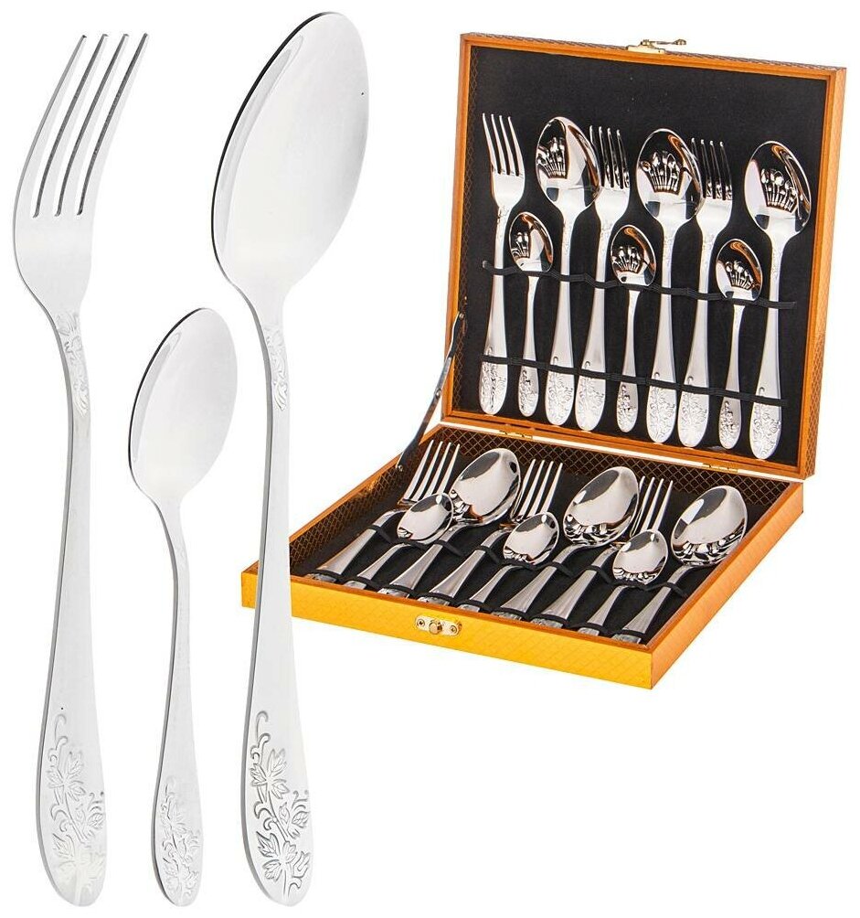 Набор состоиз из 18 предметов - 6 столовых ложек, 6 столовых вилок, 6 чайных ложек. Набор идет в подарочном деревянном кейсе, который также подойдет для дальнейшего хранения столовый приборов.